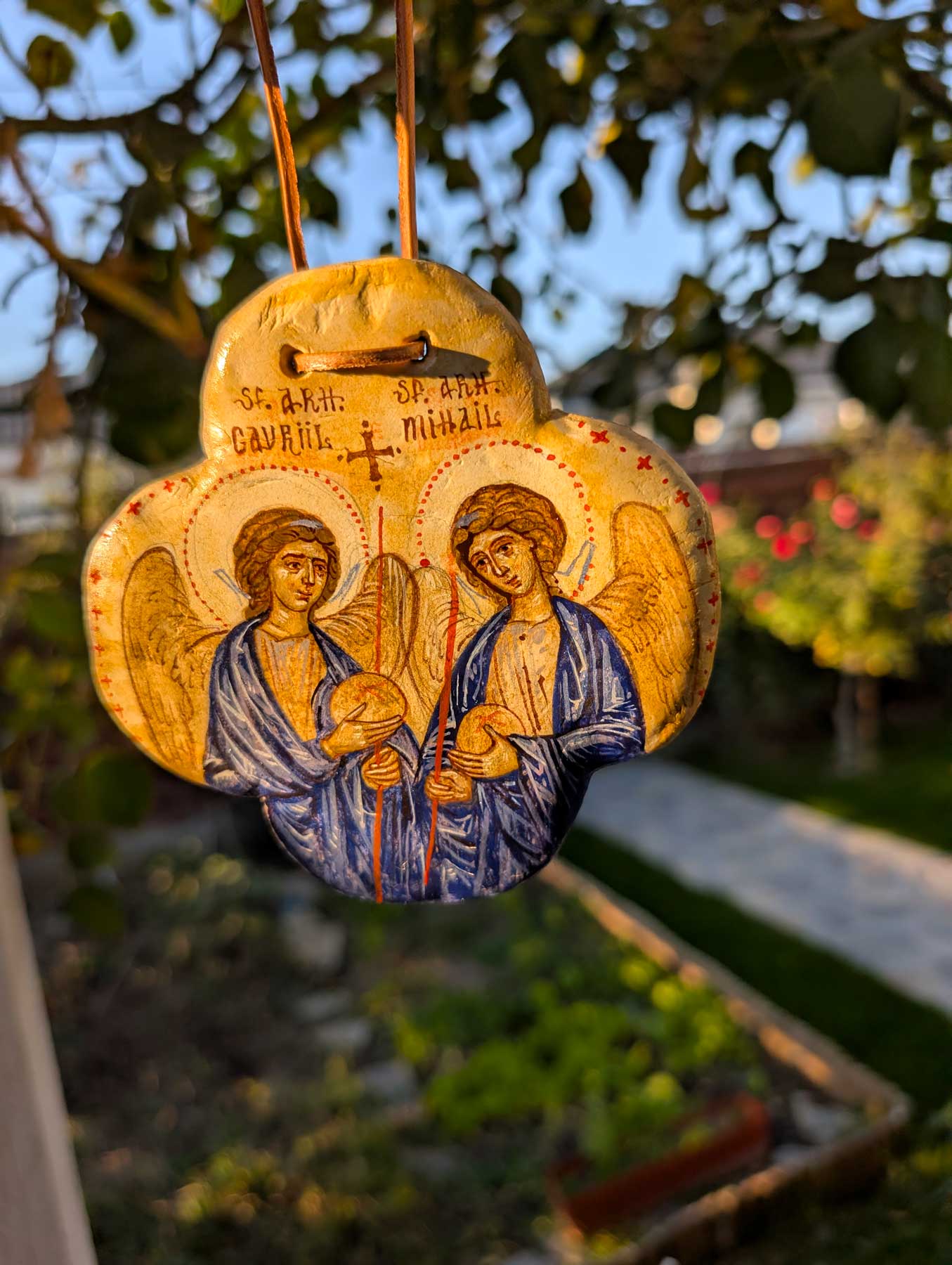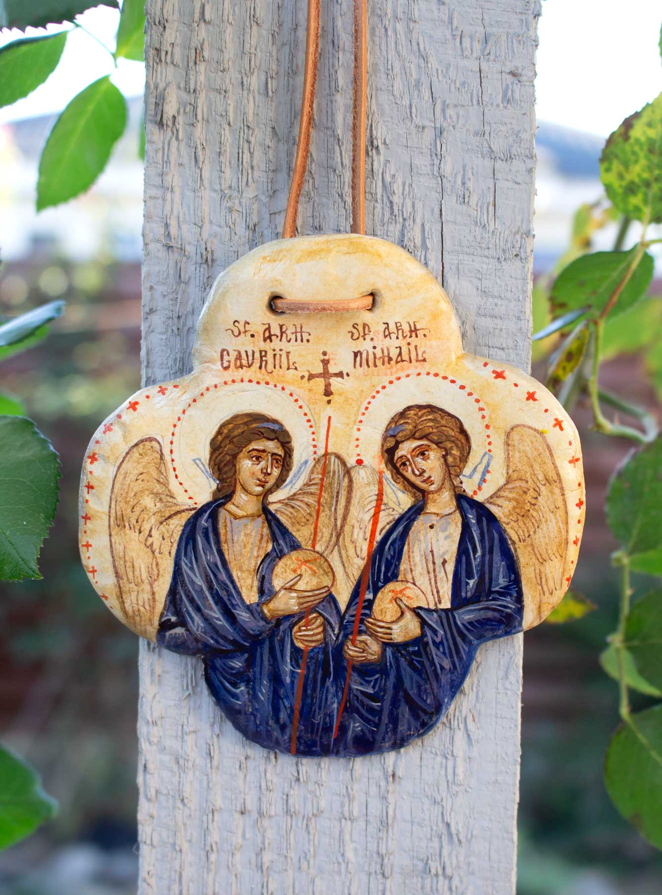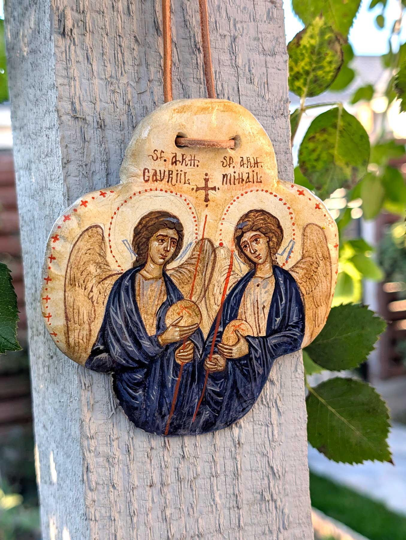Crucea pictată cu Sfinții Arhangheli Mihail și Gavriil a fost modelată în pastă de ceramică cu uscare la rece, șlefuită și pictată în straturi, la lupă, în culori de apă, folosindu-se atât transparențele tușelor, cât și culoarea plină. Crucea, semn ocrotitor și izbăvitor de vrăjmași, primește în icoană prezența Sfinților Arhangheli, care desăvârșește întreita putere a crucii..