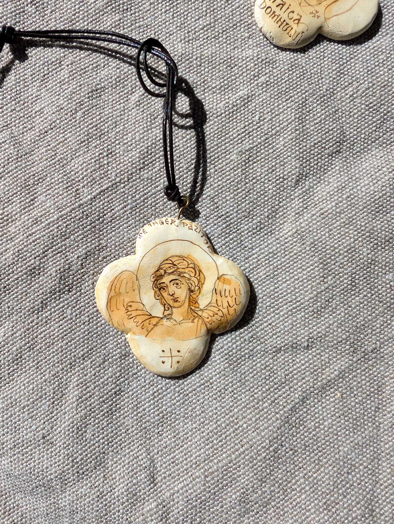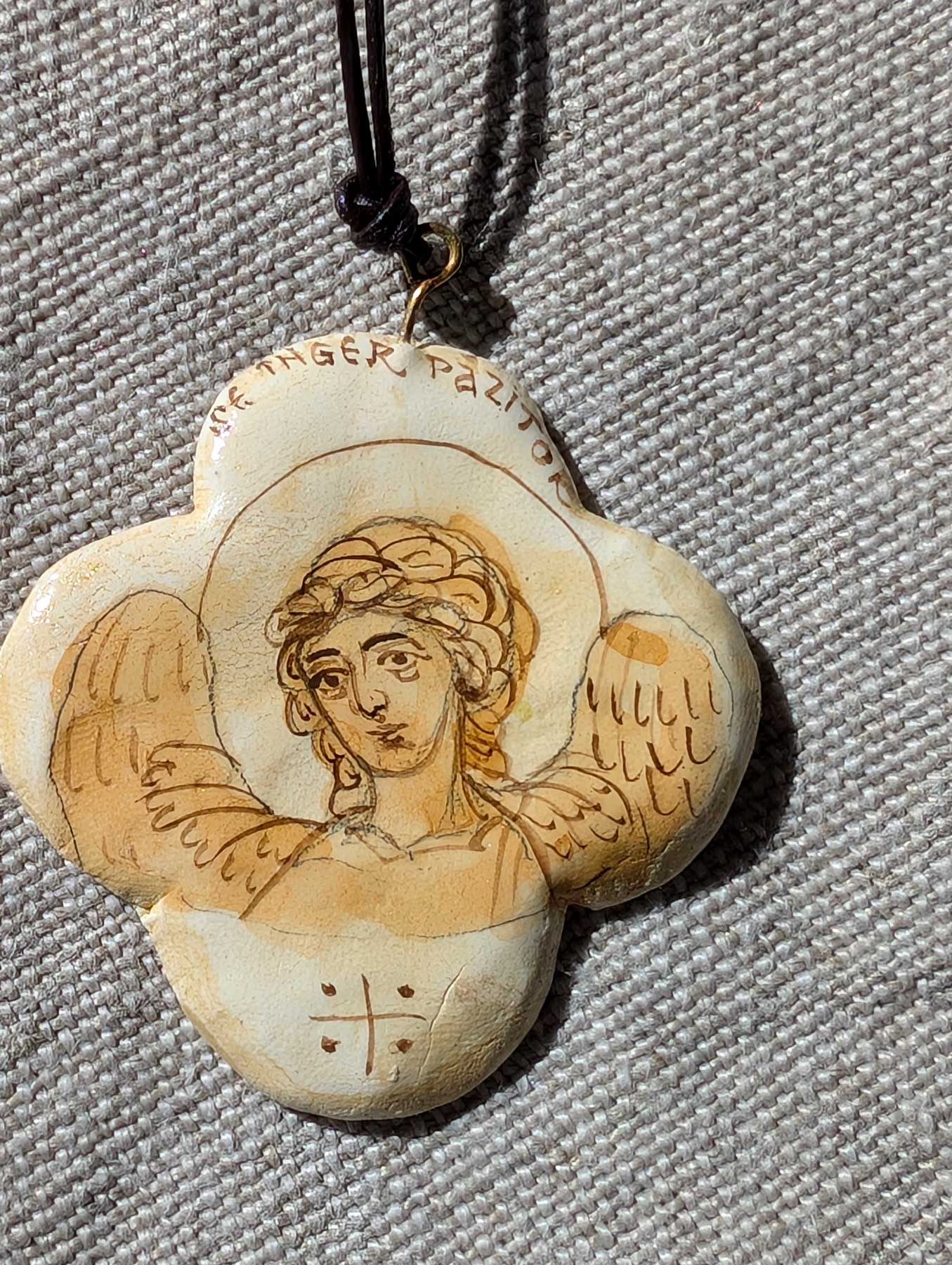 Cruciulița de botez pictată cu Sfântul Înger Păzitor a fost modelată manual din pastă de ceramică cu uscare la aer, apoi șlefuită. S-a aplicat un fundal transparent dintr-o culoare de apă, peste care s-a pictat monocrom, la mâna liberă, folosind lupa, chipul sfântului. La final, a fost aplicat un strat de vernis pentru protecție.