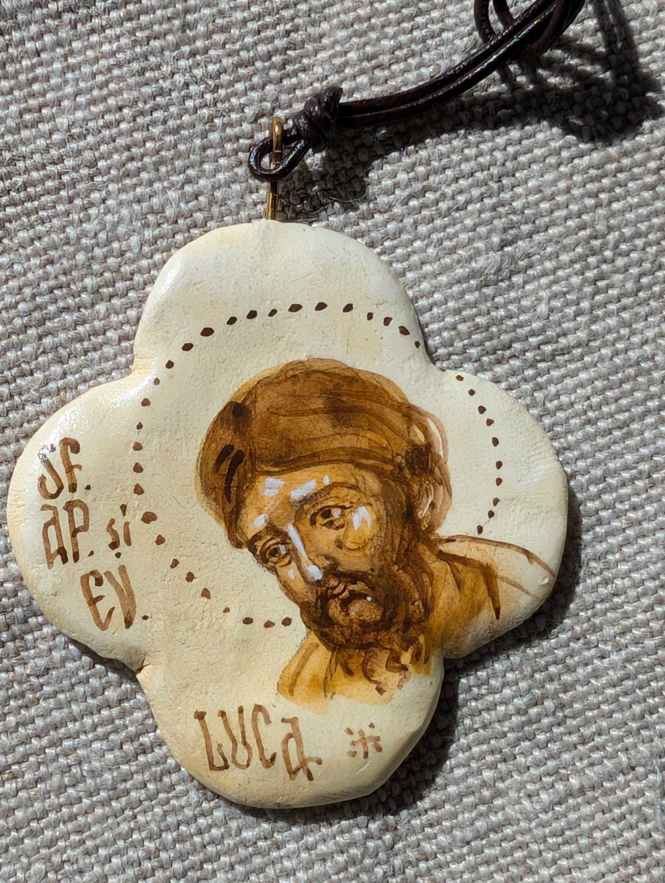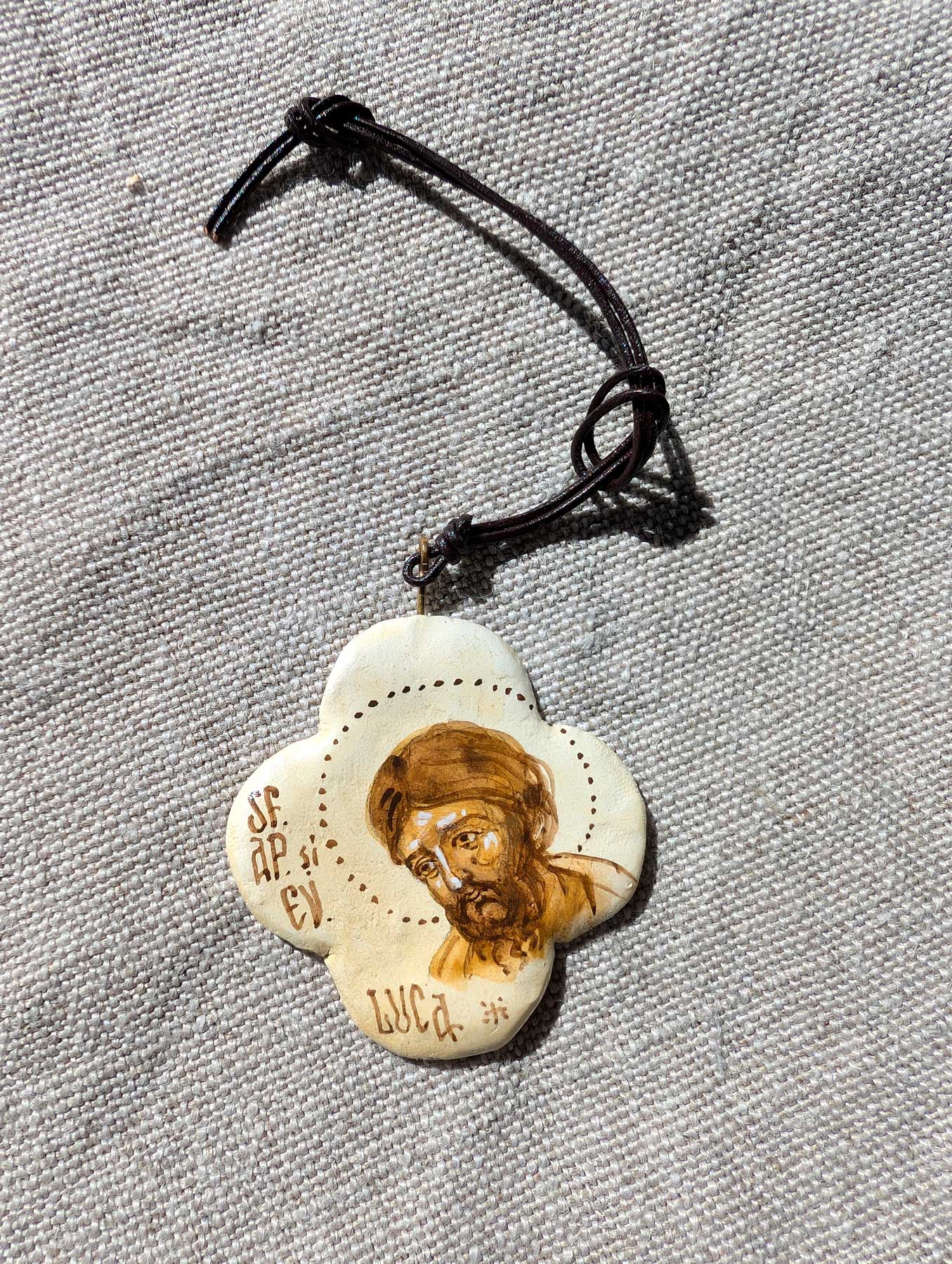 Cruciulița pictată cu Sfântul Luca apostolul a fost modelată manual din pastă de ceramică cu uscare la aer, apoi șlefuită. S-a aplicat un fundal transparent dintr-o culoare de apă, peste care s-a pictat monocrom, la mâna liberă, folosind lupa, chipul sfântului. La final, a fost aplicat un strat de vernis pentru protecție.