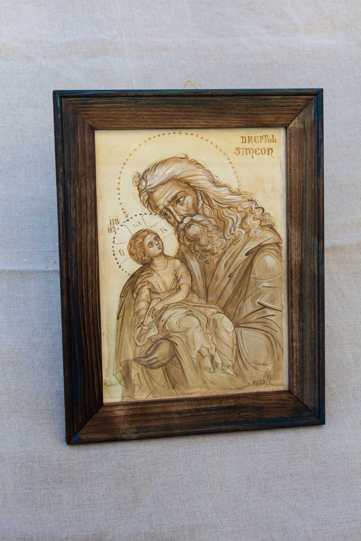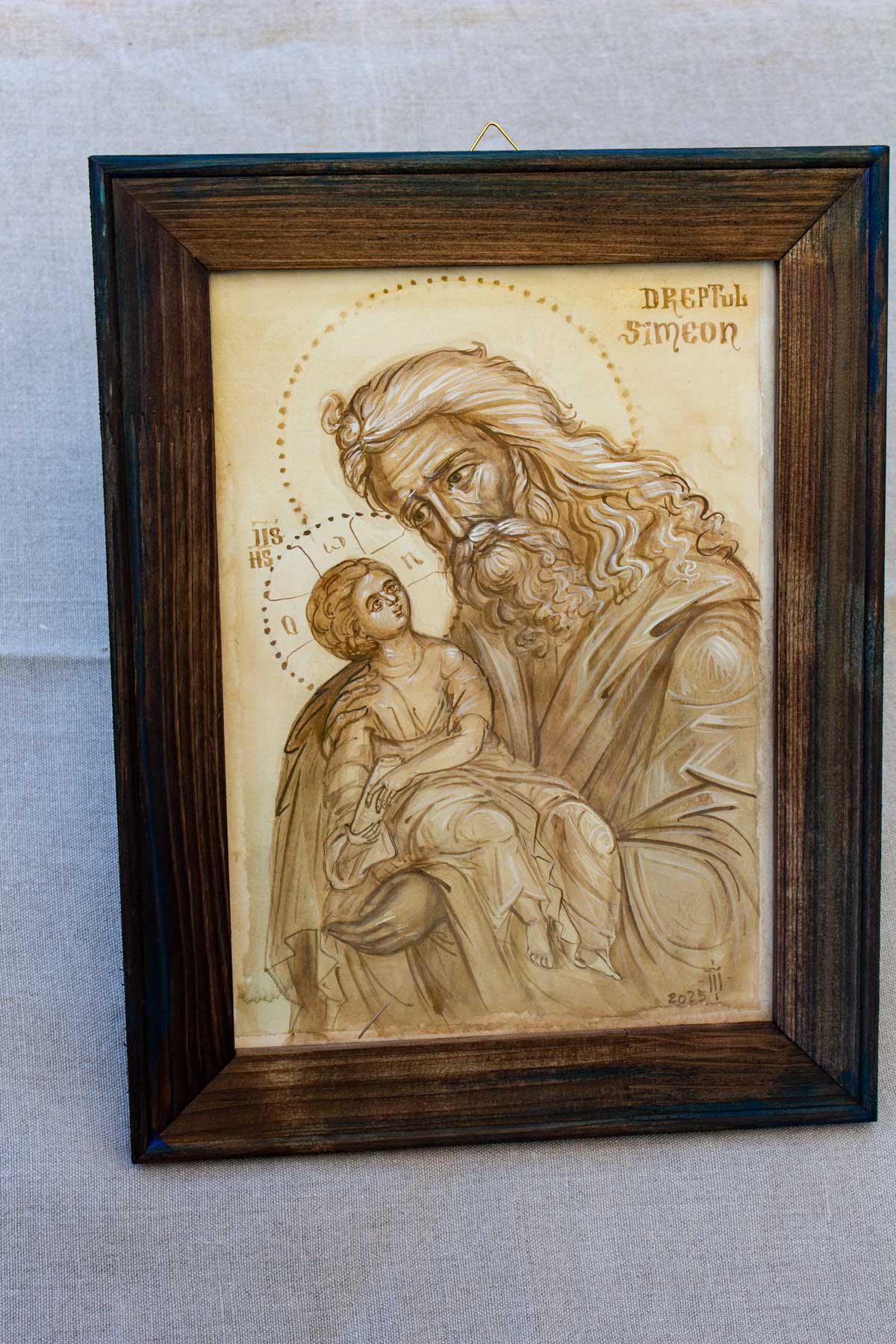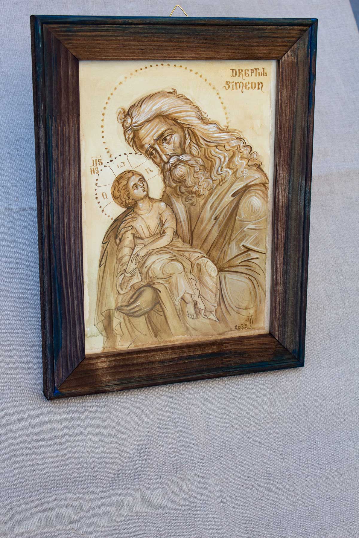 Dreptul Simeon – icoană pictată monocrom în tehnică mixtă (acuarelă și guașă) pe hârtie de acuarelă 300 gr. Icoana este asociată Praznicului Împărătesc al Întâmpinării Domnului de către Dreptul Simeon și Proorocița Ana. Pruncul Iisus este înfățișat mai matur, ca și în alte icoane în care apare drept Prunc, deoarece se vrea a fi arătată maturitatea sufletului cu care Acesta S-a întrupat, precum și drumul misiunii Lui, acceptat înaninte de a se naște, misiune care vine cu apăsare înaintea firii pruncești a Mântuitorului.