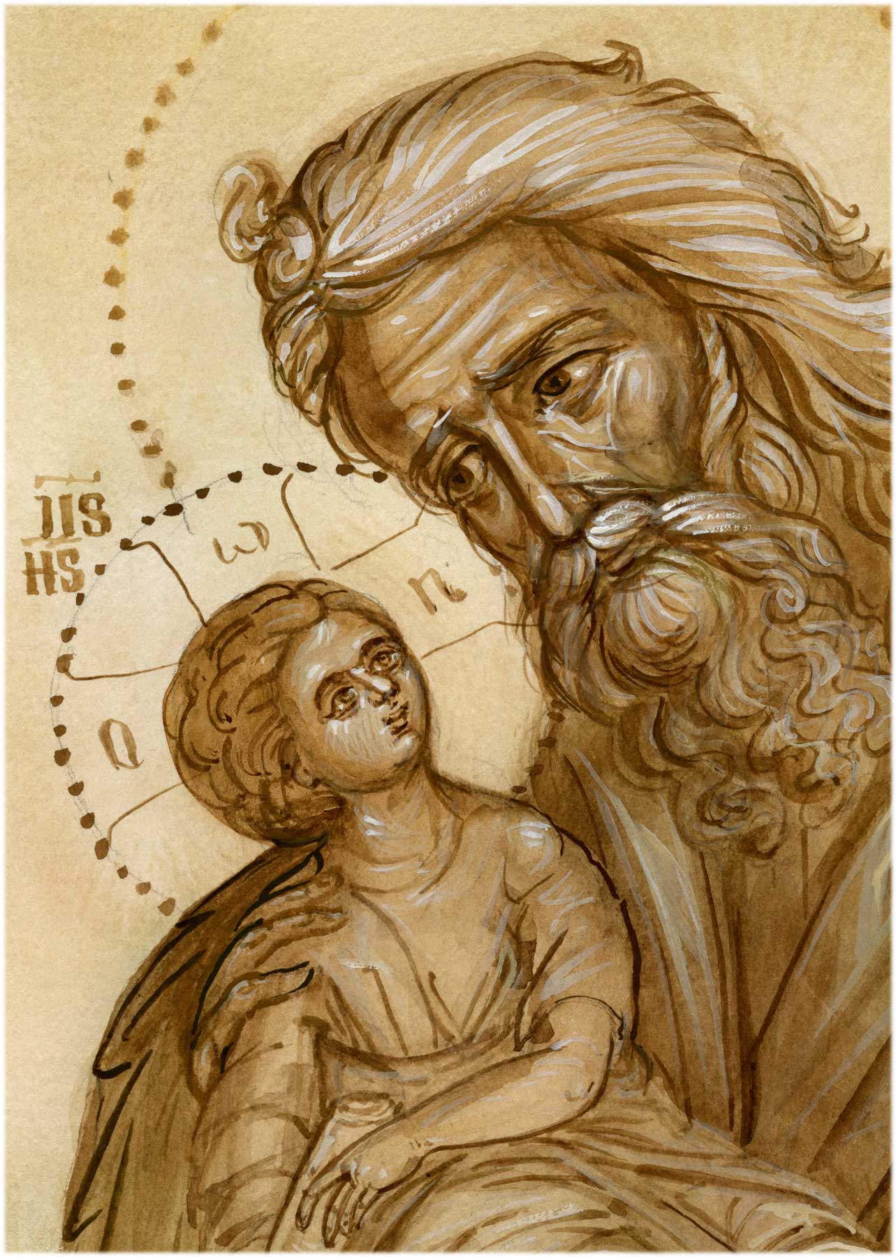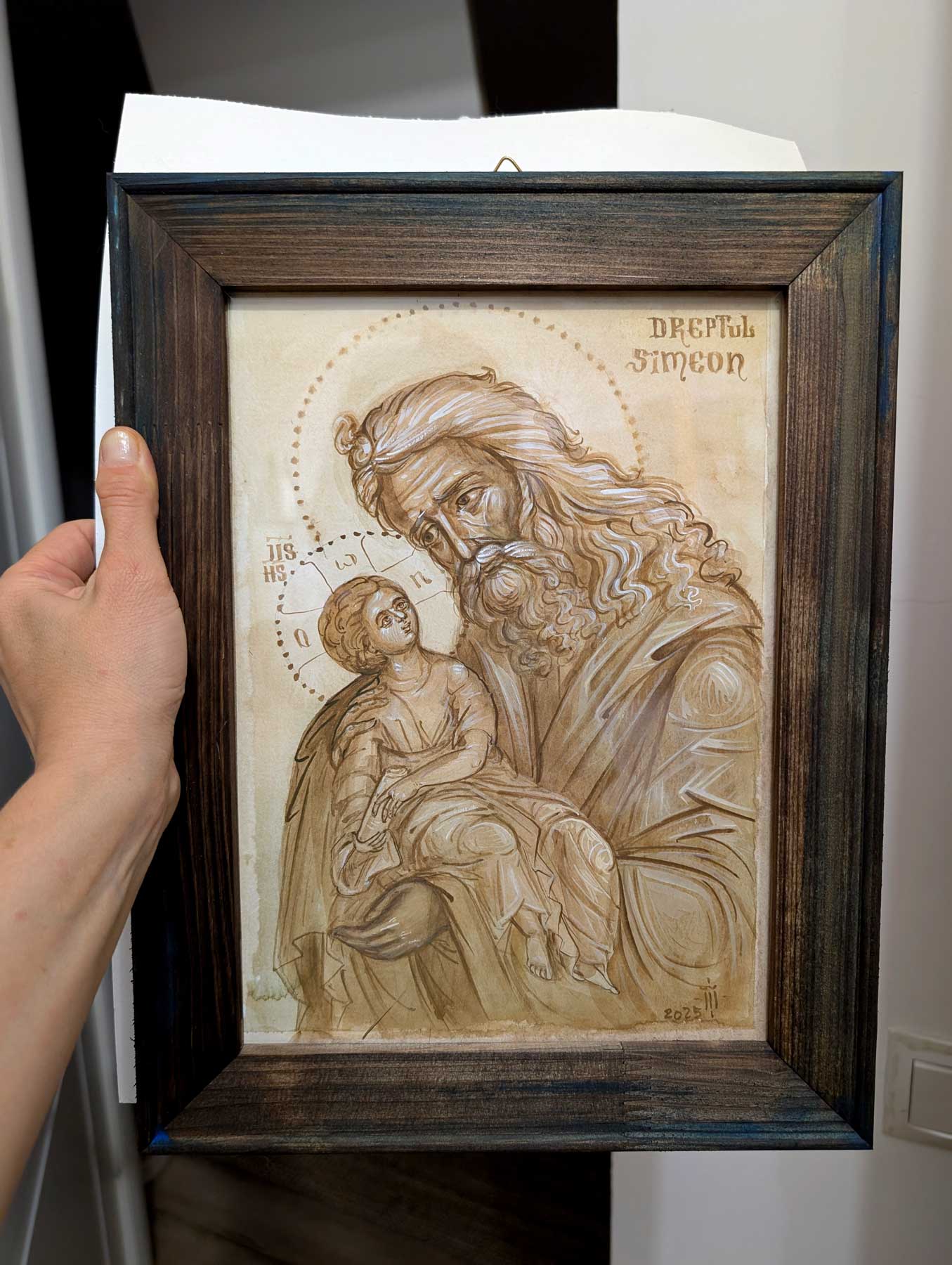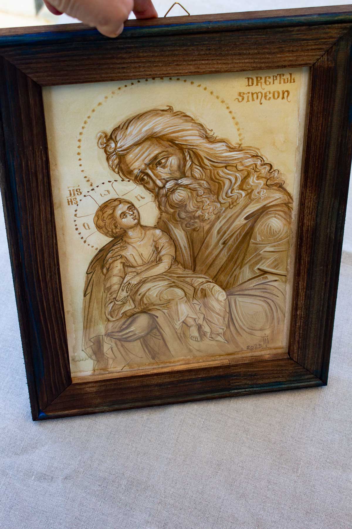 Dreptul Simeon – icoană pictată monocrom în tehnică mixtă (acuarelă și guașă) pe hârtie de acuarelă 300 gr. Icoana este asociată Praznicului Împărătesc al Întâmpinării Domnului de către Dreptul Simeon și Proorocița Ana. Pruncul Iisus este înfățișat mai matur, ca și în alte icoane în care apare drept Prunc, deoarece se vrea a fi arătată maturitatea sufletului cu care Acesta S-a întrupat, precum și drumul misiunii Lui, acceptat înaninte de a se naște, misiune care vine cu apăsare înaintea firii pruncești a Mântuitorului.