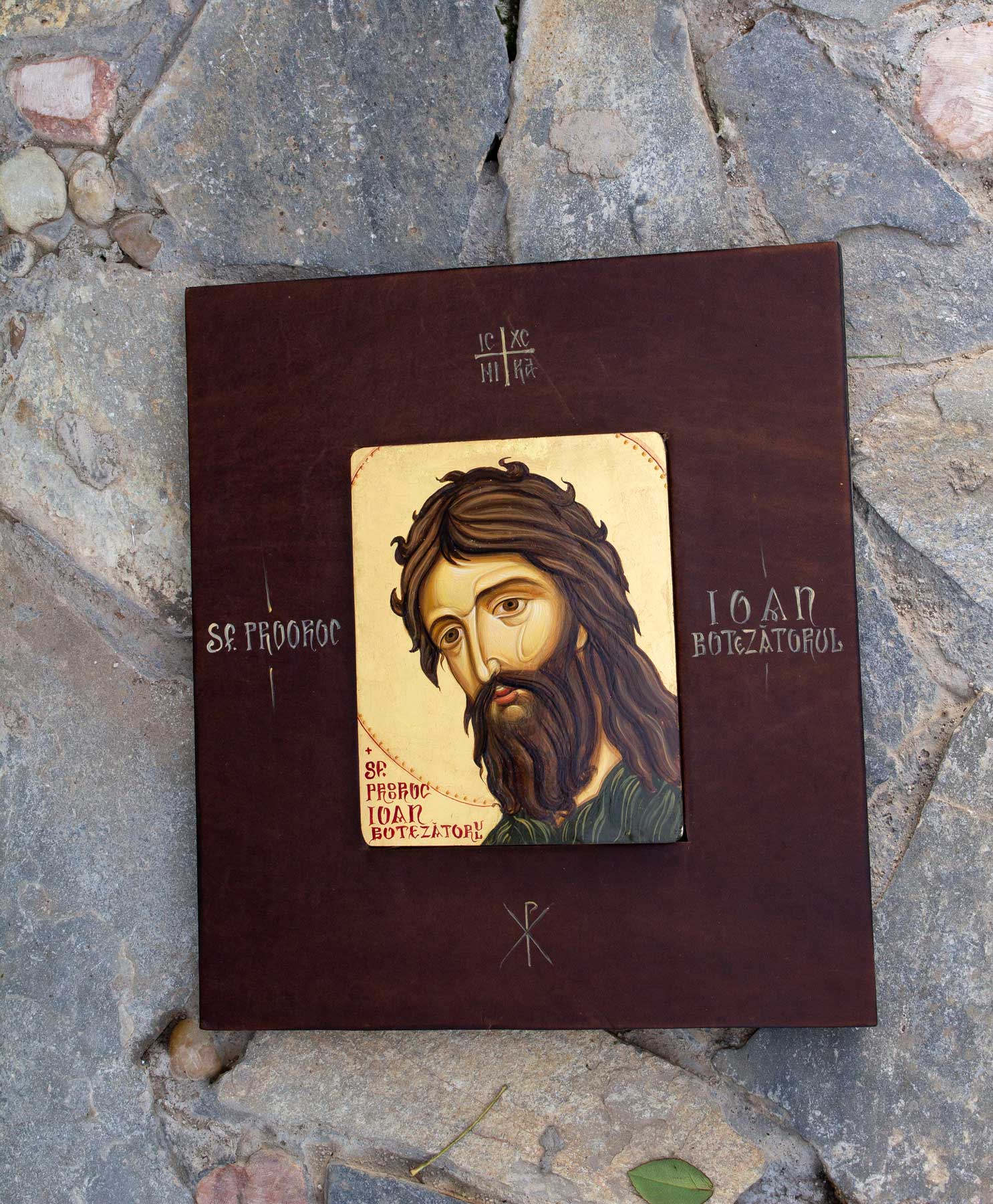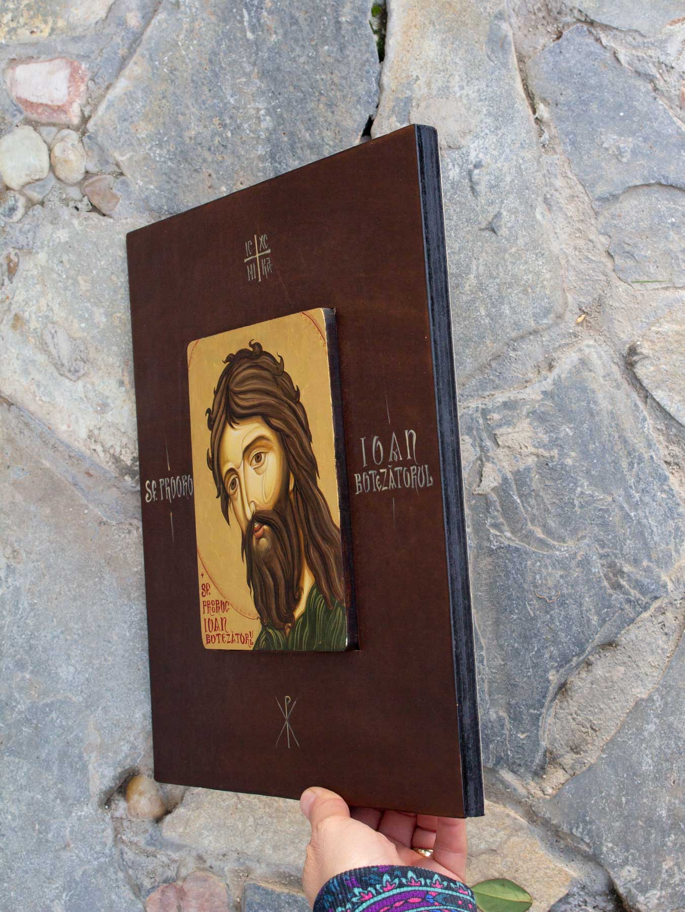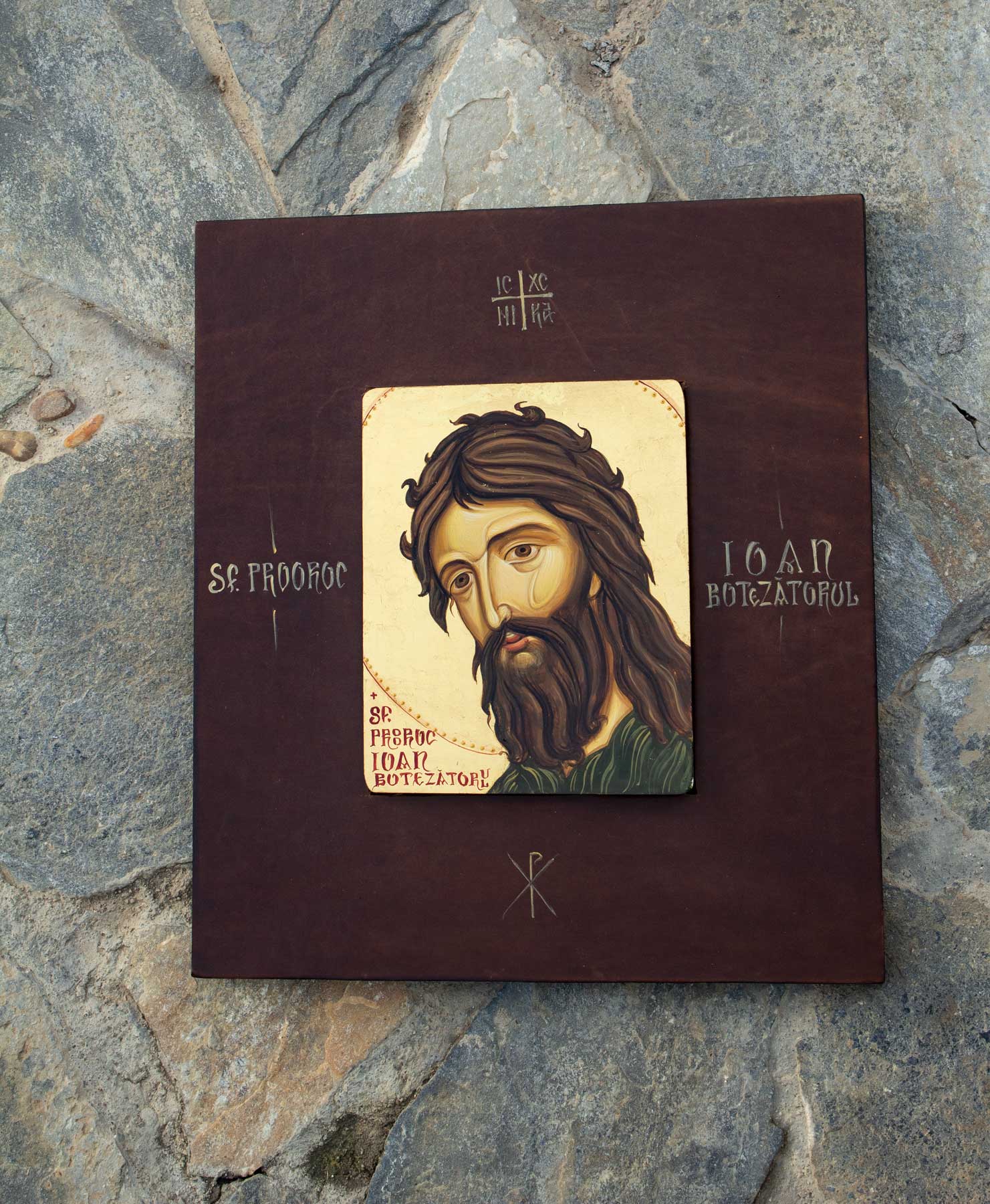 Icoană cu Sfântul Ioan Botezătorul. Lucrarea este un produs original 100%. Pictura a fost realizată în straturi pe un blat din lemn preparat, a fost făcută la mâna liberă (fără șabloane) în tehnica tradițională veche: tempera/ pigment cu emulsie de ou. S-a aplicat foiță de aur pur de 22 k. La sfârșit icoana a fost sigilată cu vernis special. Este o lucrare de colecție, pictată în anul 2016.