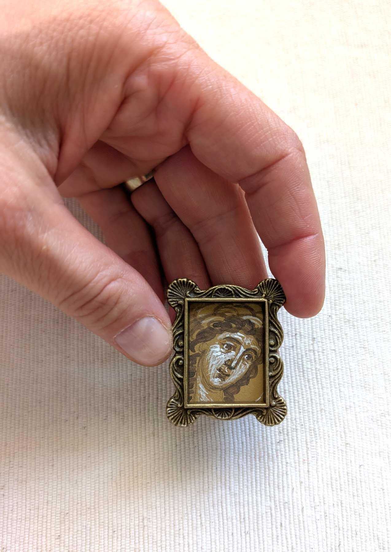 Icoană miniatură pictată la mâna liberă în tempera cu ou pe hârtie de acuarelă. Este încadrată într-o ramă de metal cu picior de sprijin pe spate. Poate fi purtată la sine, în genată, sau expusă oriunde în casă.