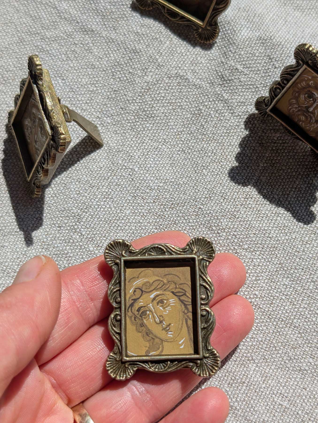 Icoană miniatură pictată la mâna liberă în tempera cu ou pe hârtie de acuarelă. Este încadrată într-o ramă de metal cu picior de sprijin pe spate. Poate fi purtată la sine, în genată, sau expusă oriunde în casă.
