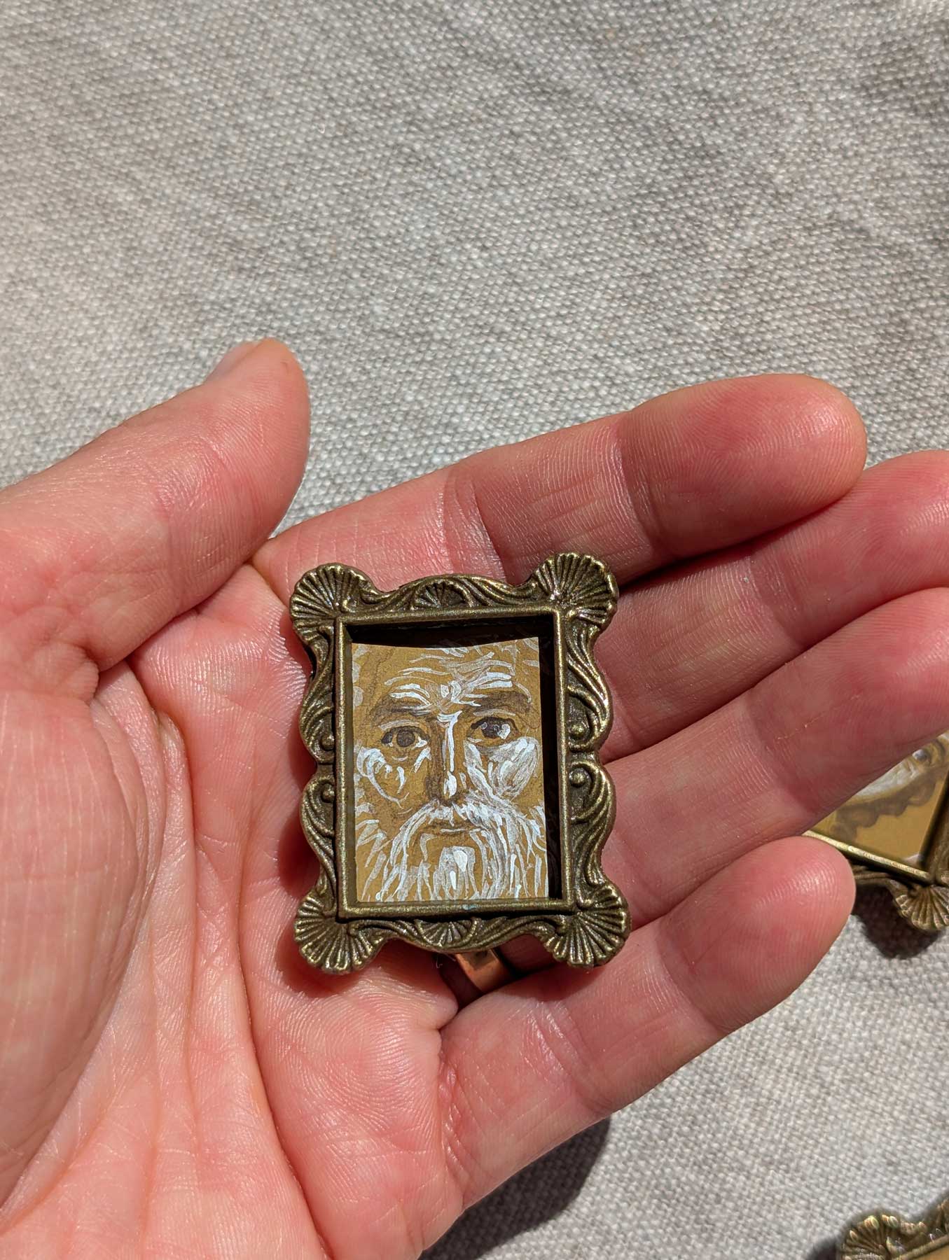 Icoană miniatură pictată la mâna liberă în tempera cu ou pe hârtie de acuarelă. Este încadrată într-o ramă de metal cu picior de sprijin pe spate. Poate fi purtată la sine, în genată, sau expusă oriunde în casă.