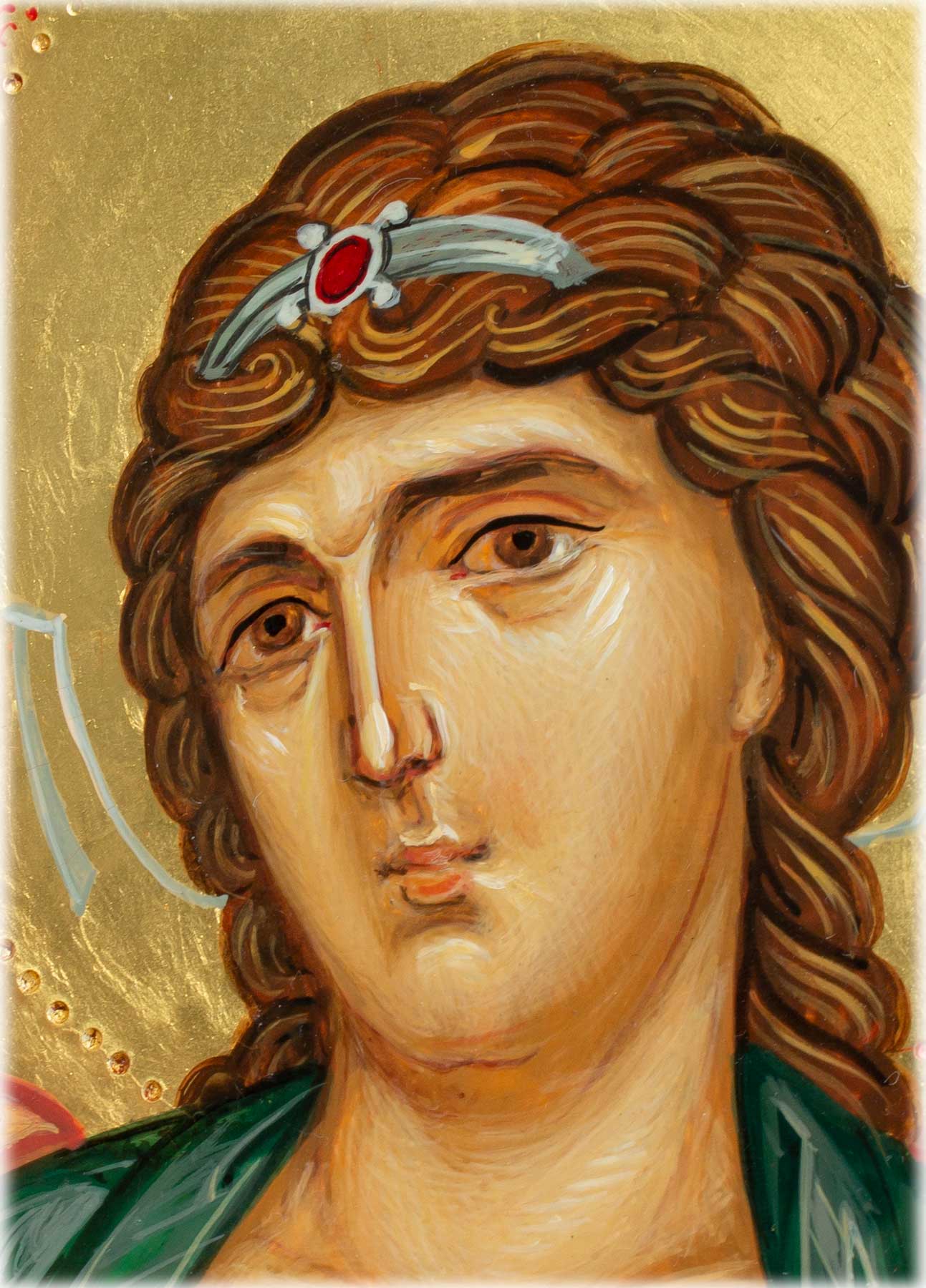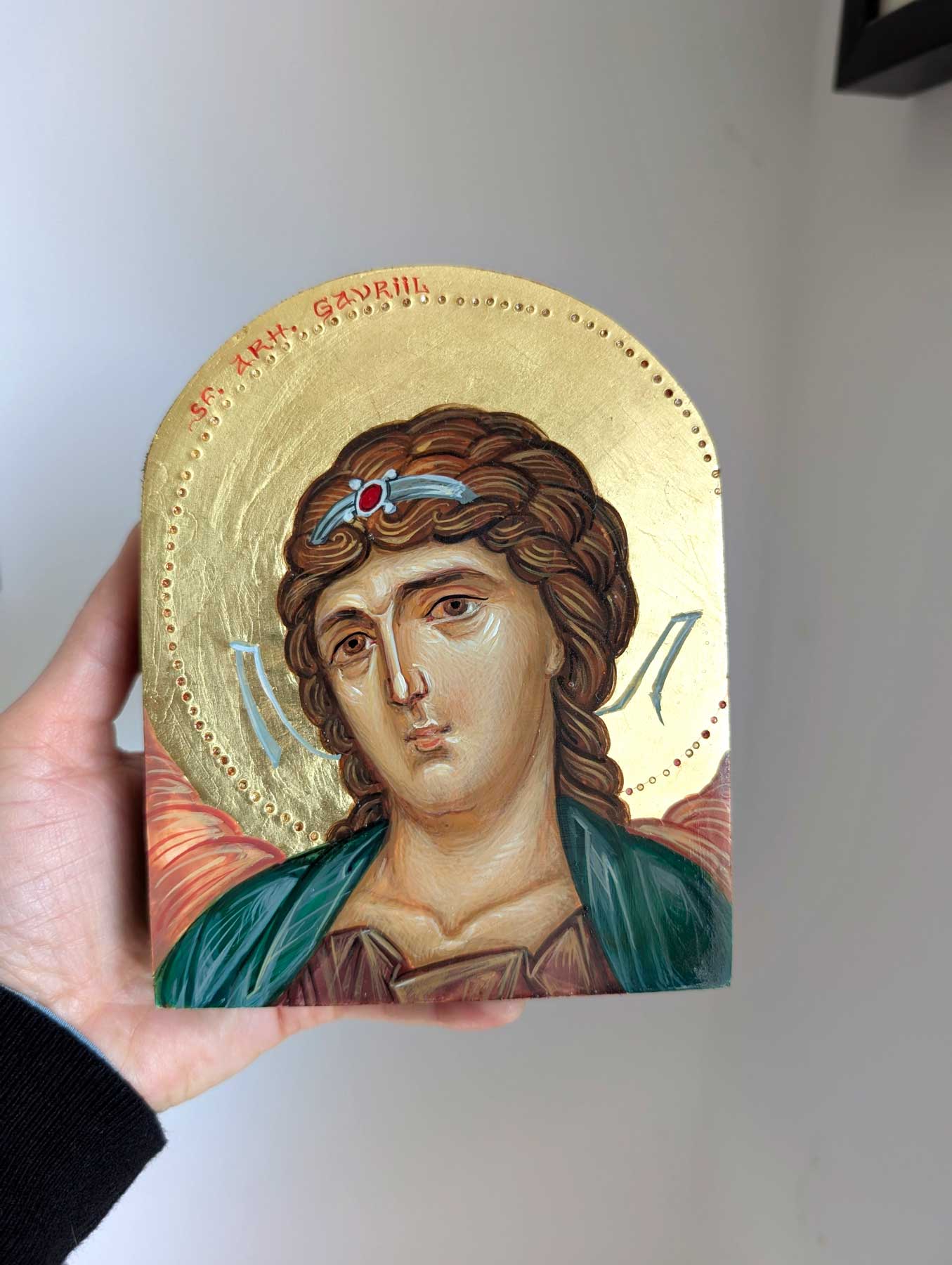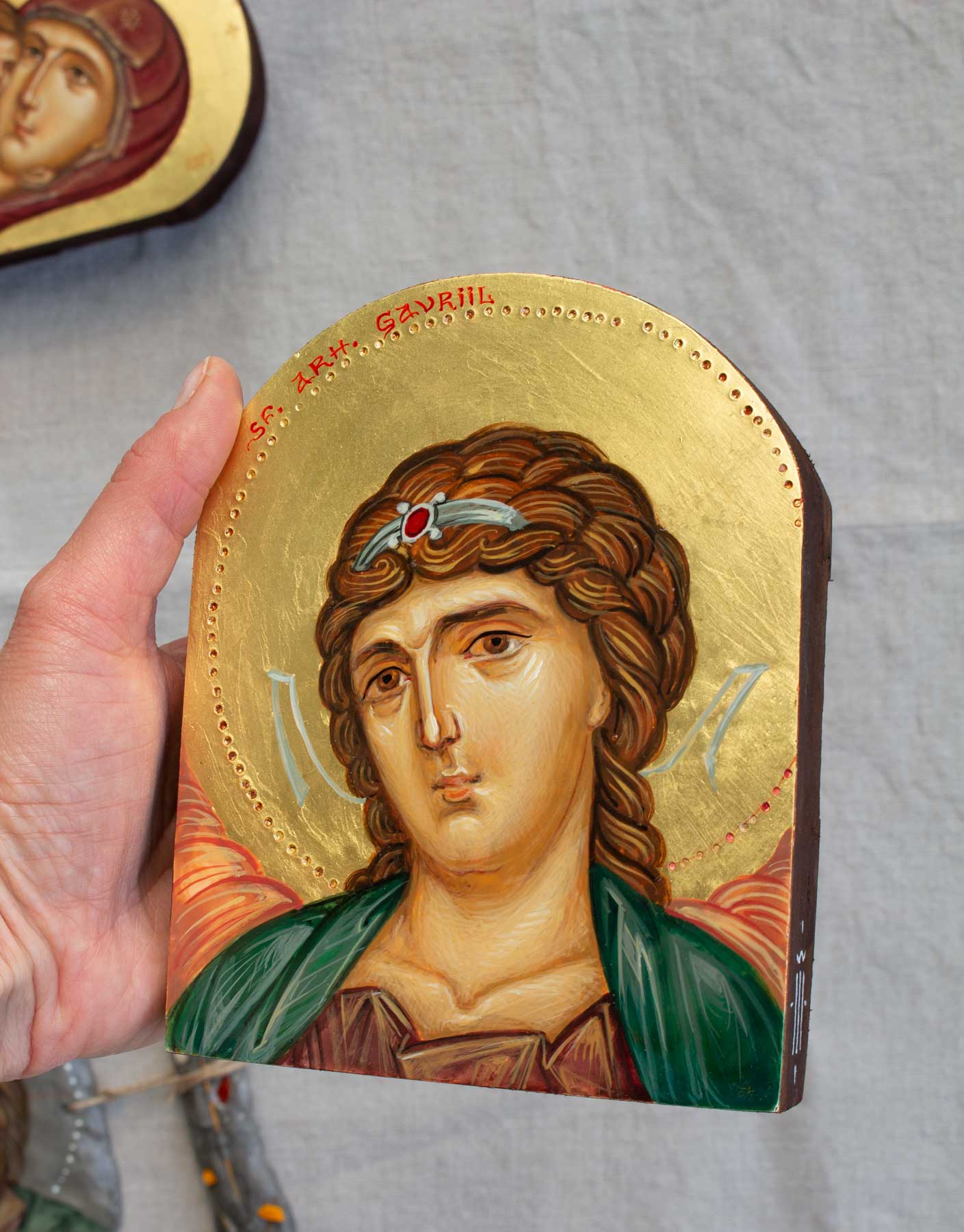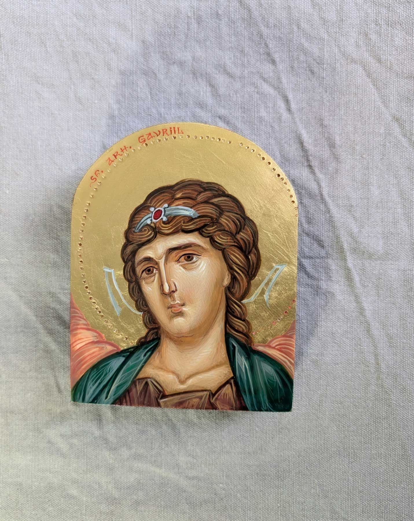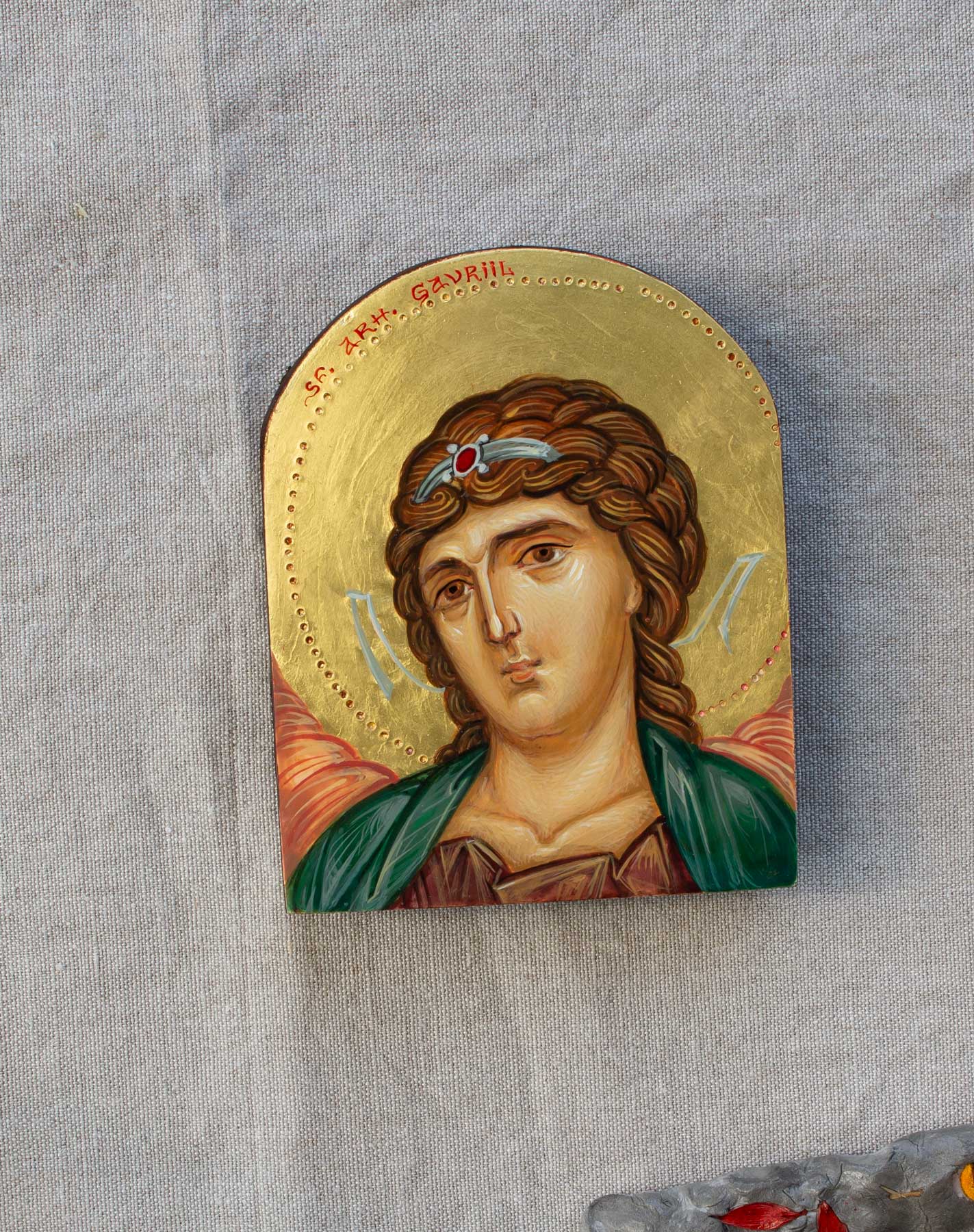 Icoană pictată cu Sfântul Arhanghel Gavriil, purtătorul bunelor vestiri. Gabriel, Gavriil – din ebraică: Dumnezeu este puternic, numele acesta deosebit arătându-ne nu doar că Dumnezeu este Atotputernic, ci şi că omul îşi găseşte puterea în Dumnezeu, adică în credinţă şi iubire: puterea de a trece peste orice greutate, puterea sufletească de a răzbi şi învinge în viaţă: Dumnezeu este scăparea şi puterea noastră, ajutor întru necazurile ce ne împresoară (Psalmul 45, 1).