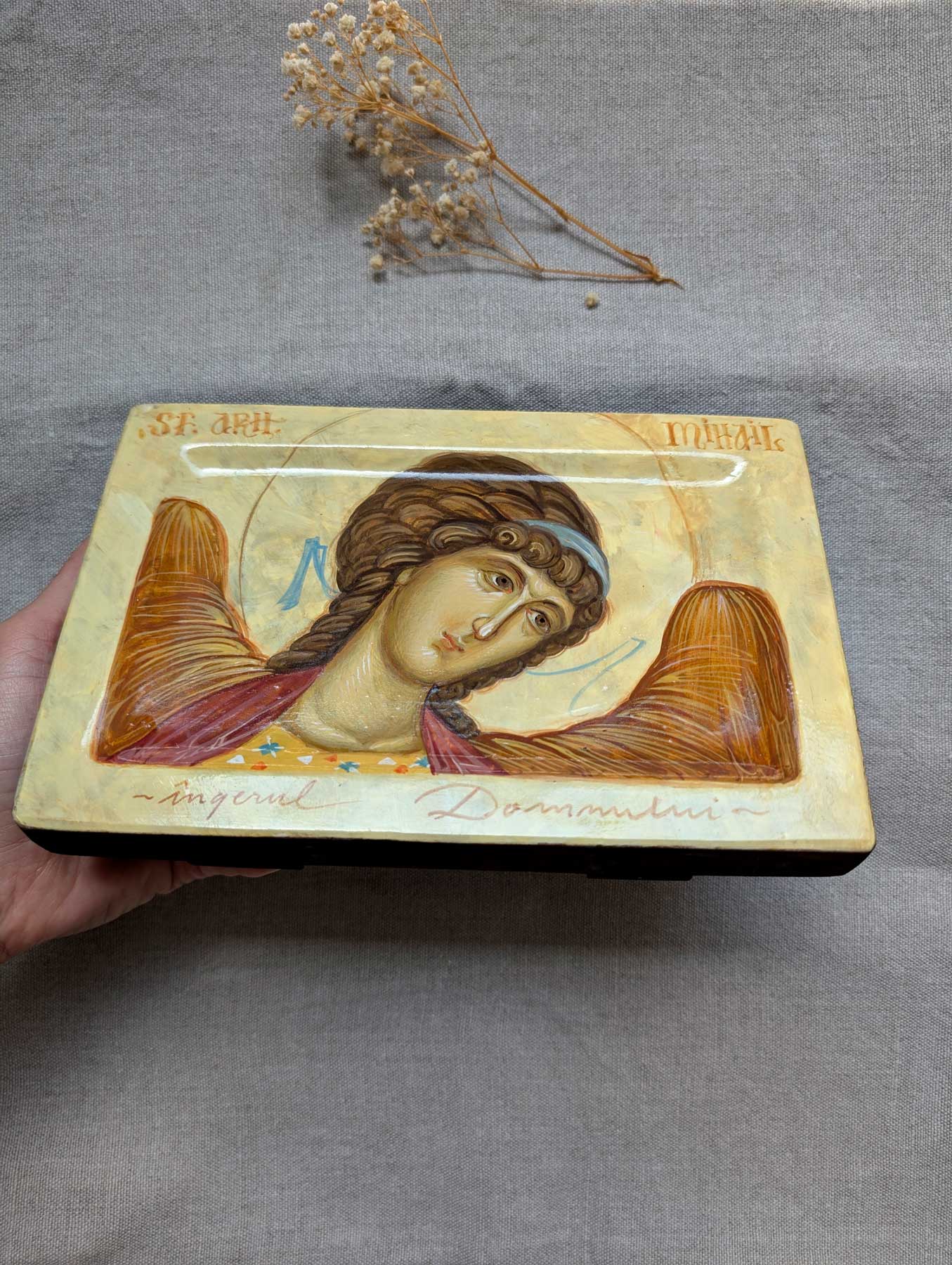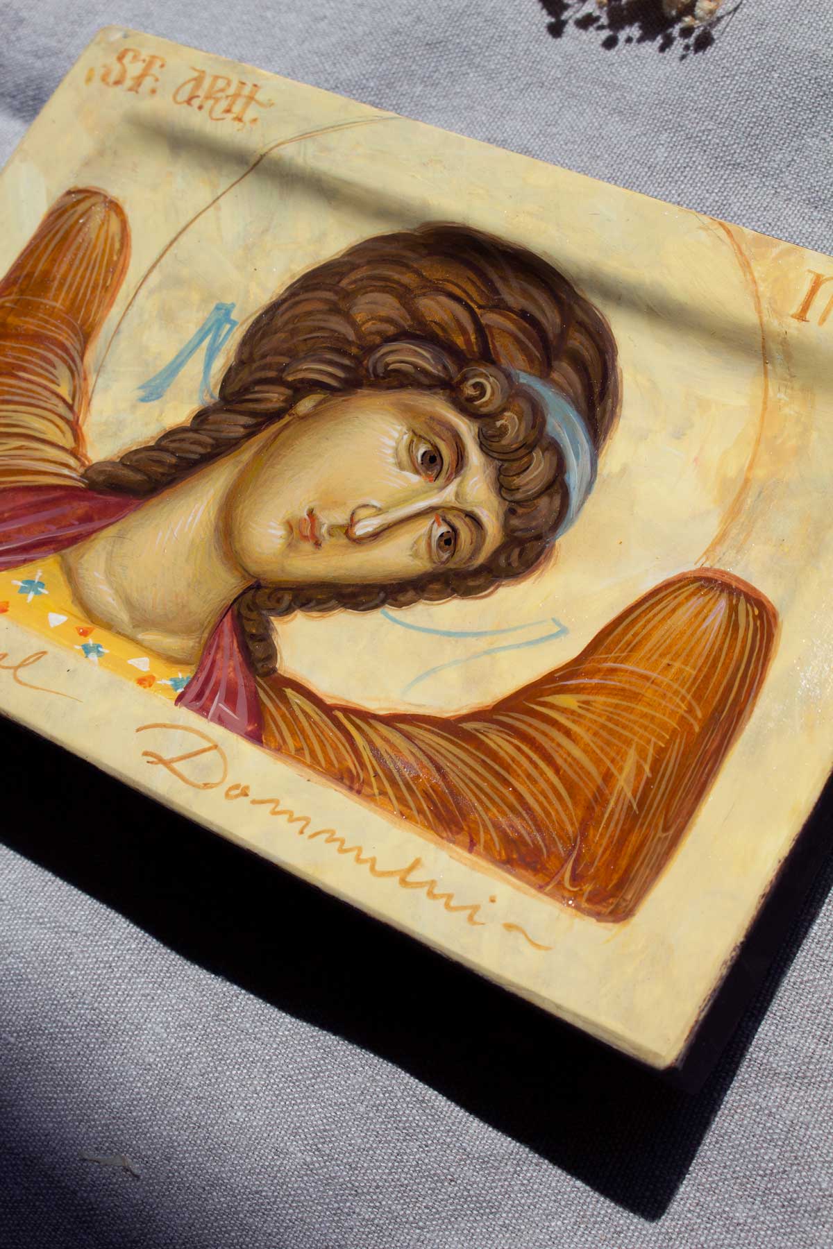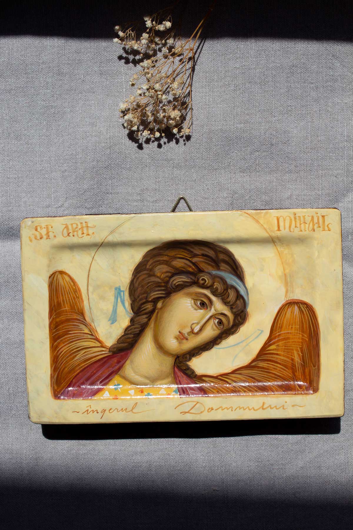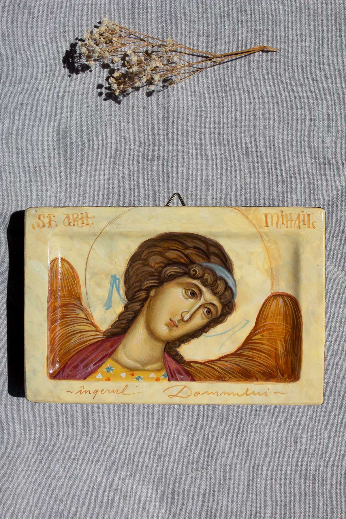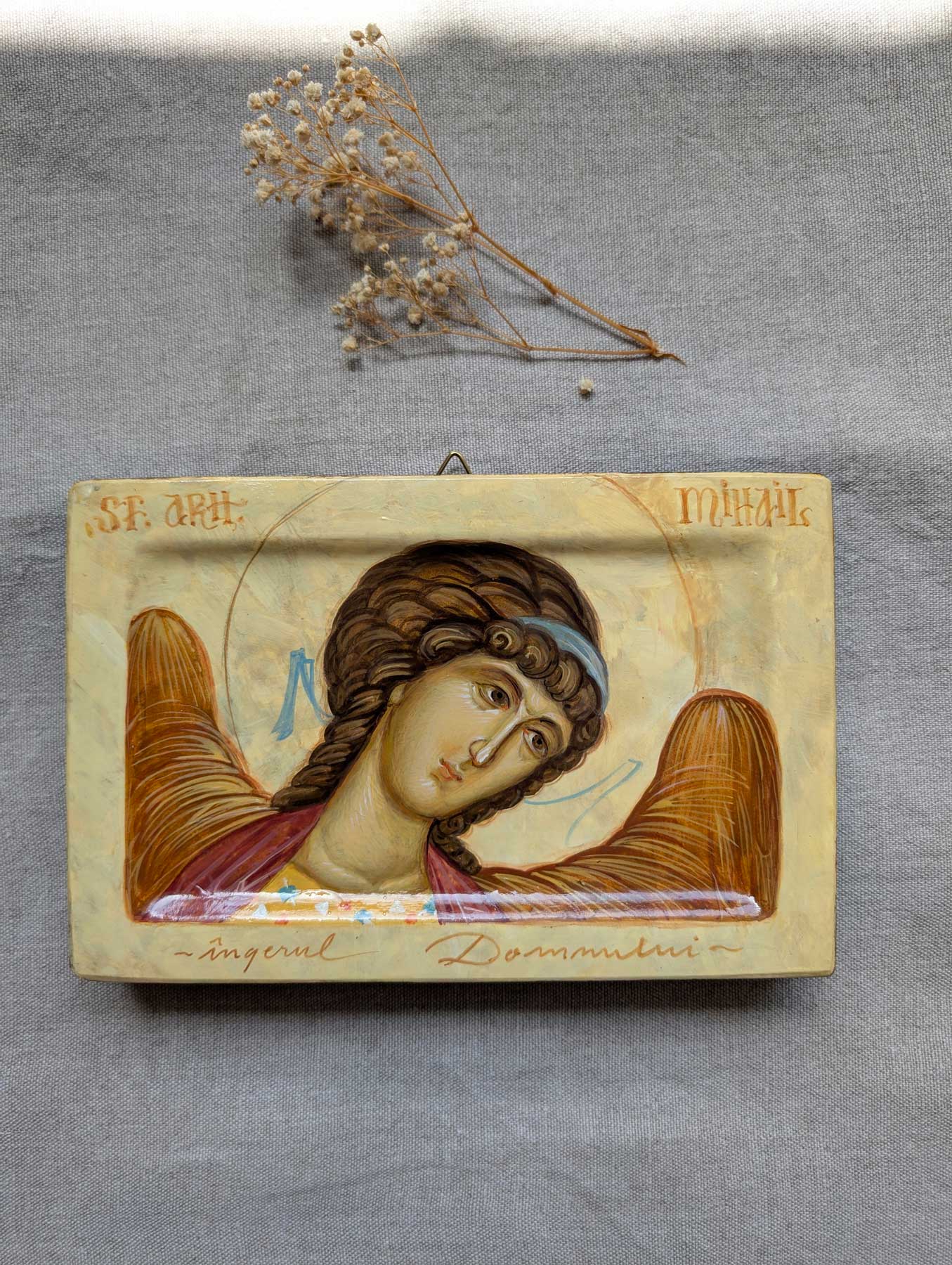 Icoană cu Chipul Sfântului Arhanghel Mihail, pictată în stilul bizanti, în tehnica veche- tempera cu ou și foiță de aur de 23k, vernisată cu vernis Talens. Suportul pentru pictat este un blat din lemn de tei săpat, prevăzut cu pene pe spate, preparat cu grund și șmirgheluit în mai multe rânduri.