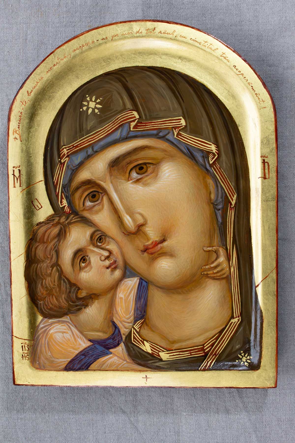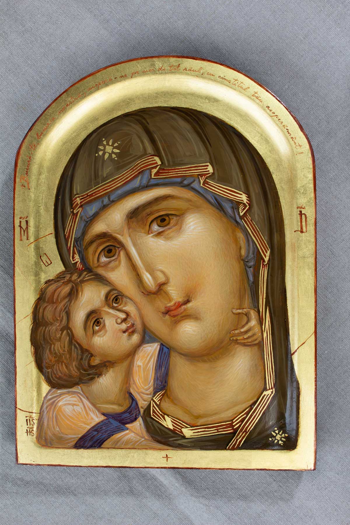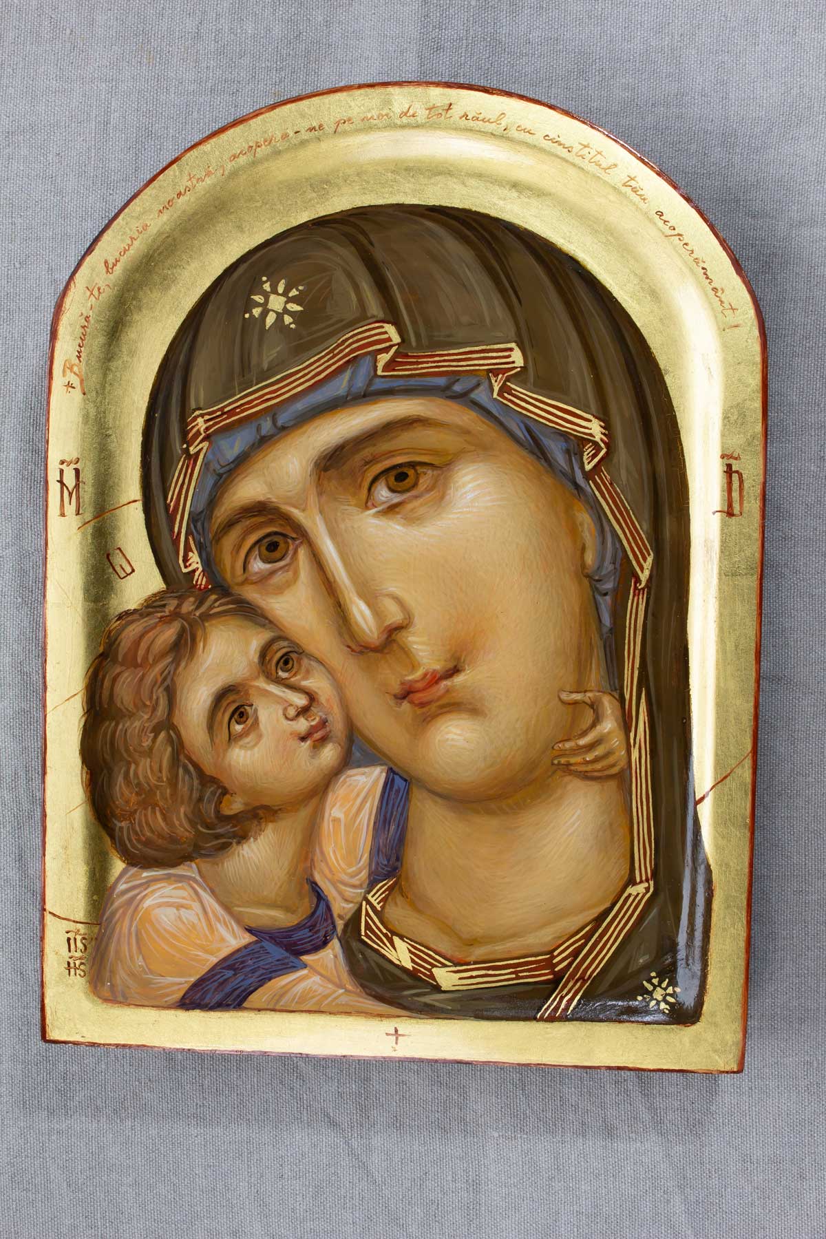 Icoană pictată cu Maica Domnului. Icoană originală, pictată pe lemn de tei săpat în interior și arcuit în partea superioară; înfățișează chipul Maicii Domnului cu Pruncul Iisus în brațe, Maica Domnului- Dulcea sărutare, având ca sursă de inspirație și de plecare varianta Maica Domnului din Vladimir