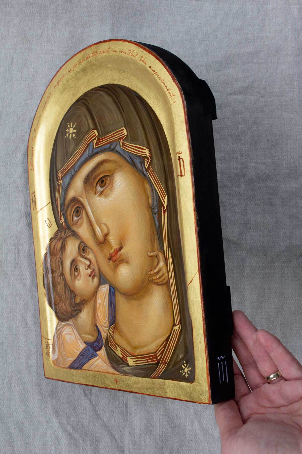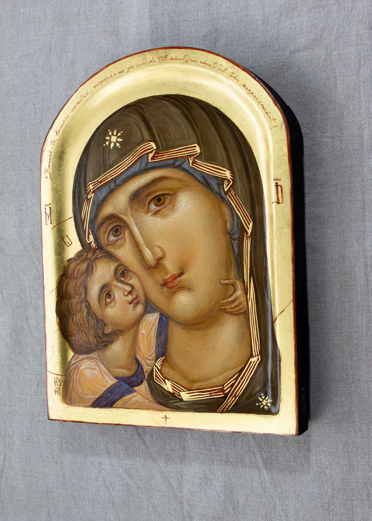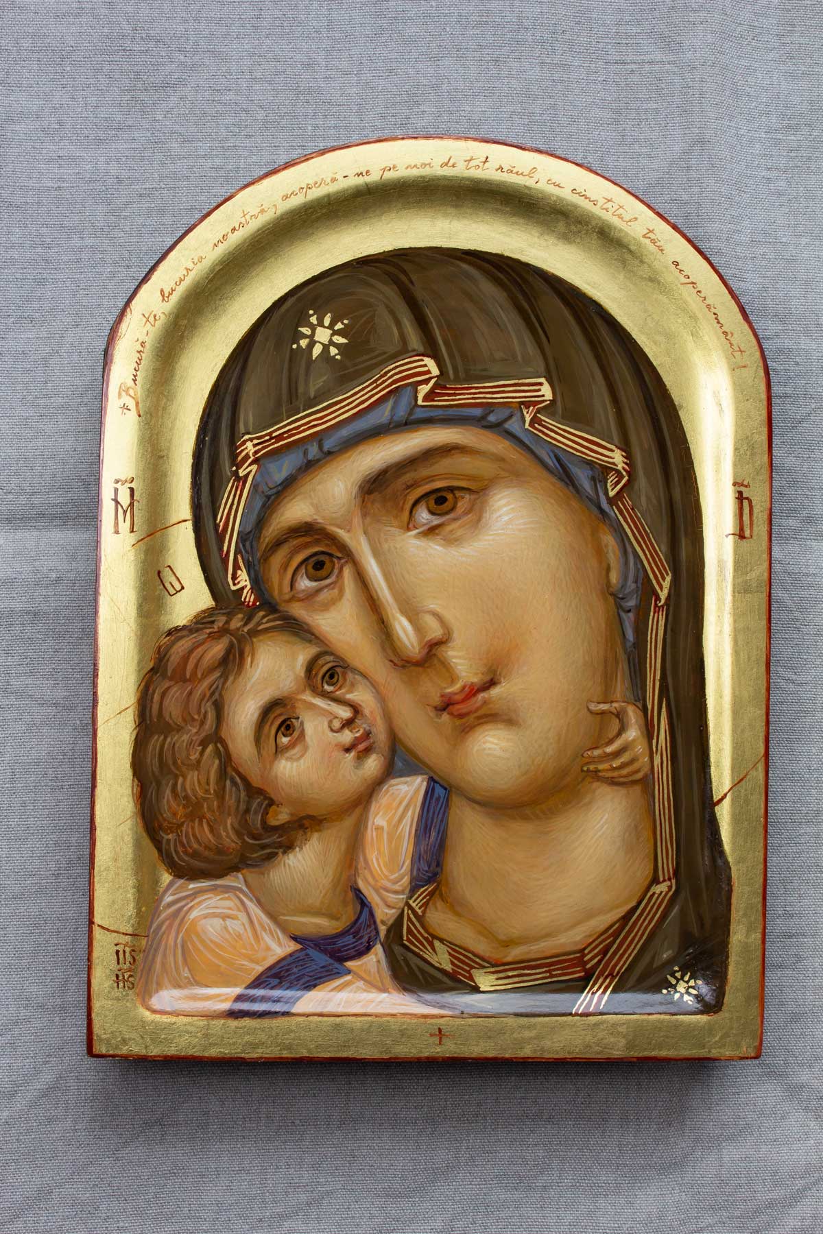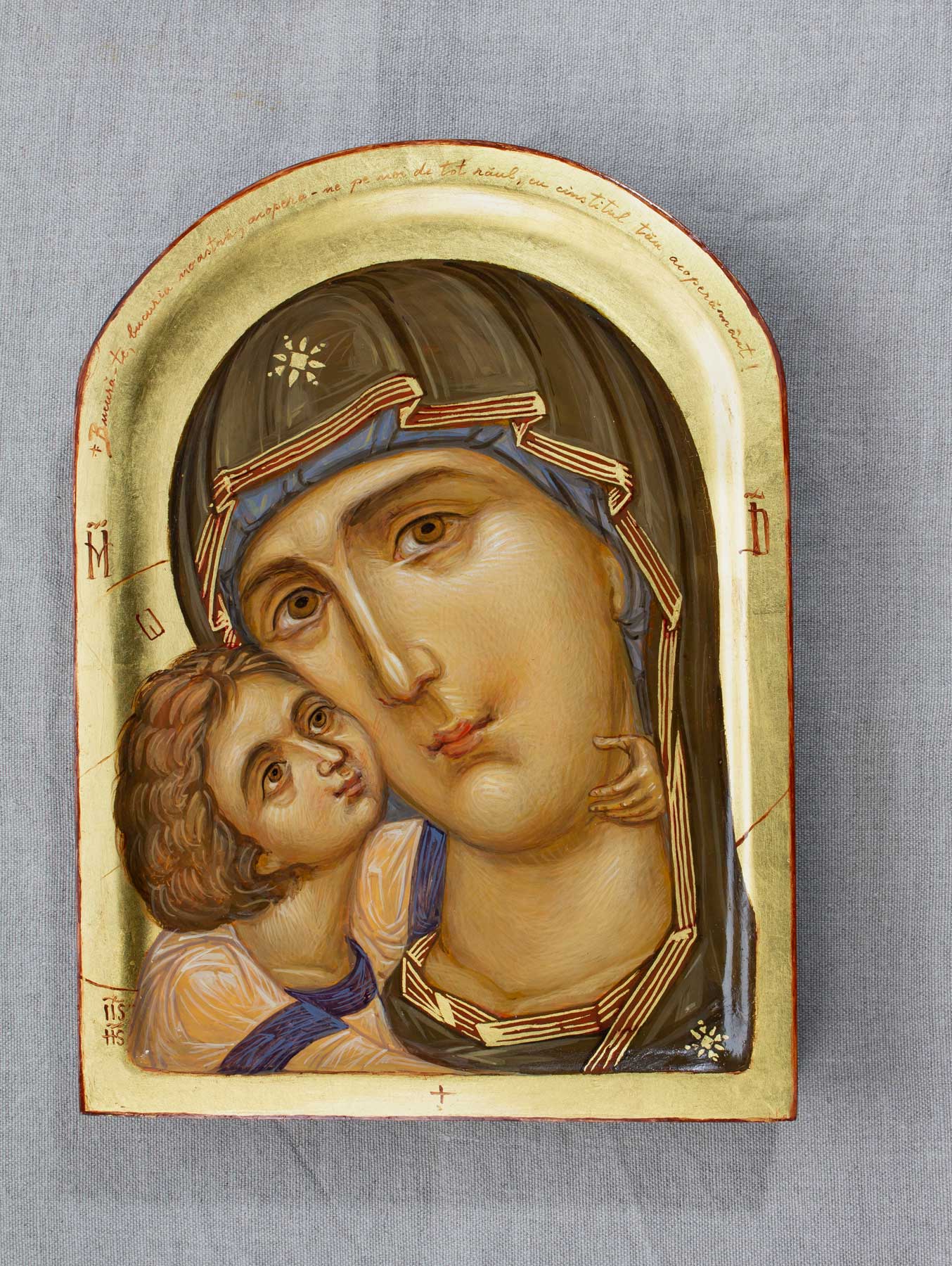 Icoană pictată cu Maica Domnului. Icoană originală, pictată pe lemn de tei săpat în interior și arcuit în partea superioară; înfățișează chipul Maicii Domnului cu Pruncul Iisus în brațe, Maica Domnului- Dulcea sărutare, având ca sursă de inspirație și de plecare varianta Maica Domnului din Vladimir