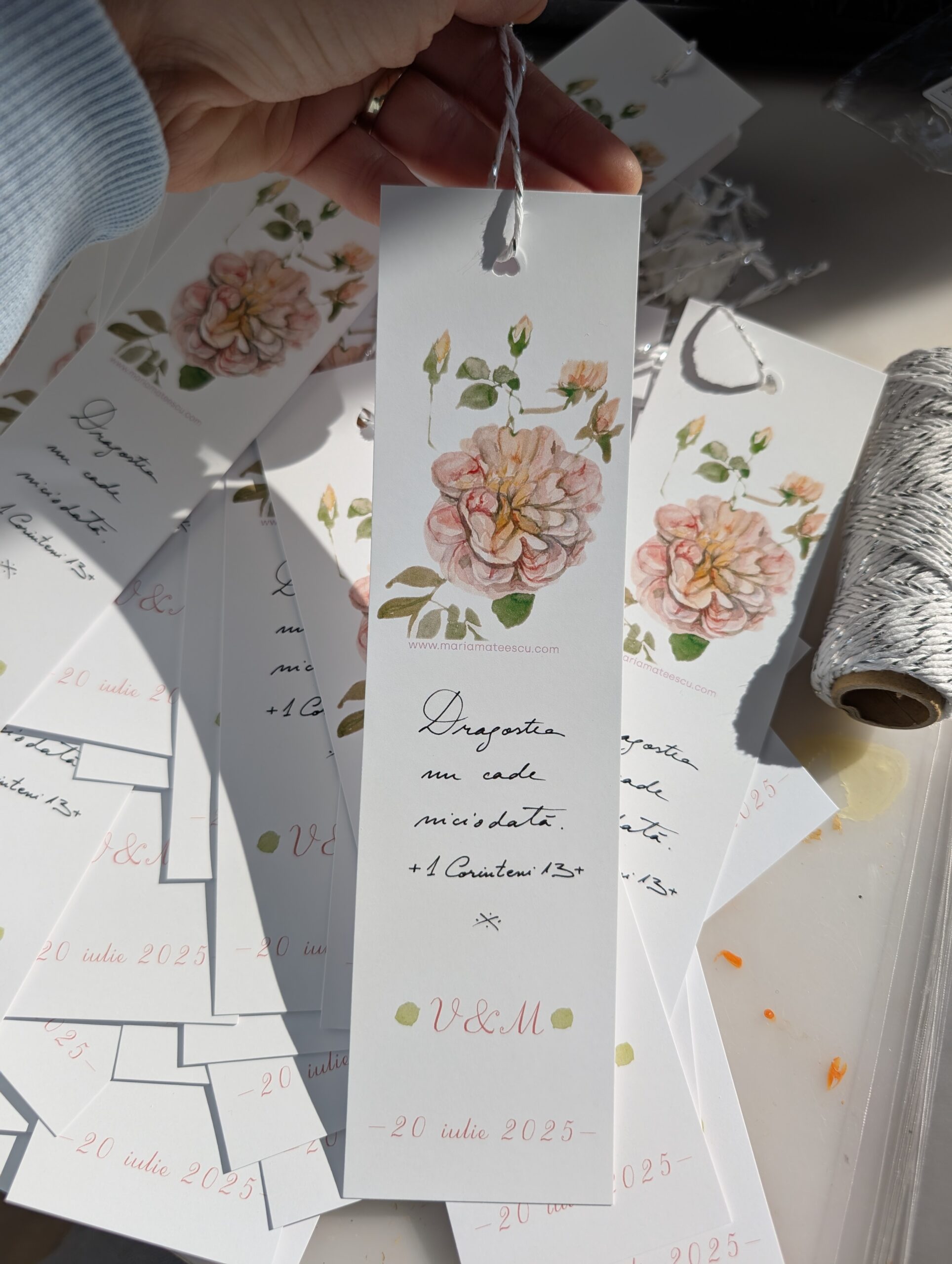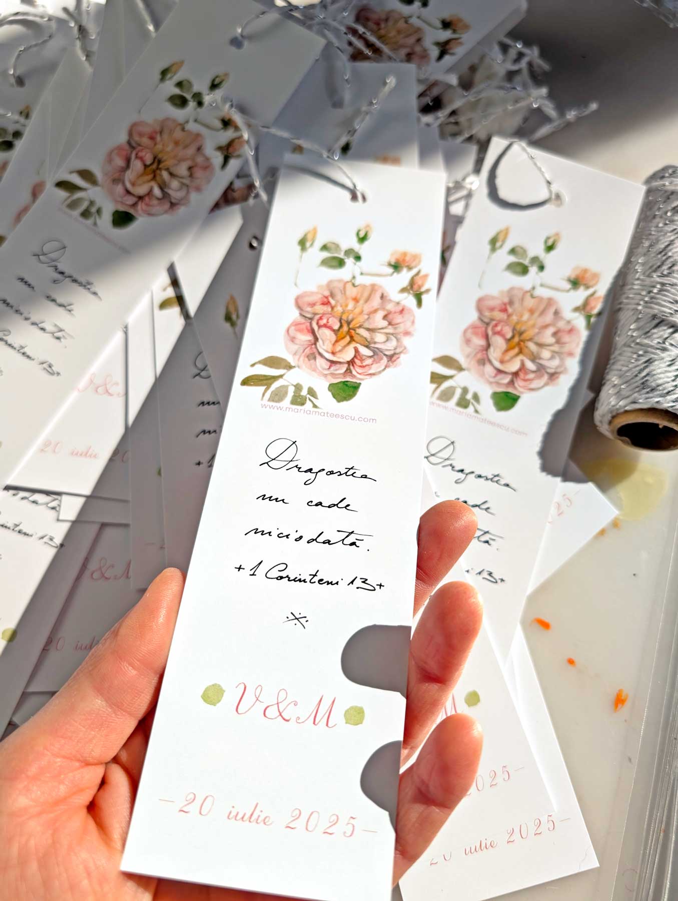 Mărturie nuntă personalizată la cerere cu numele mirilor și data nunții. Semnul de carte prezintă o ilustrație a unui trandafir rozaliu împreună cu textul preluat din Epistola către Corinteni a Sfântului Apostol Pavel: Dragostea nu cade niciodată. Un semn de aducere aminte și un cuvânt mare al binecuvântării celei mai frumoase zile cu care zilele încep împreună.
