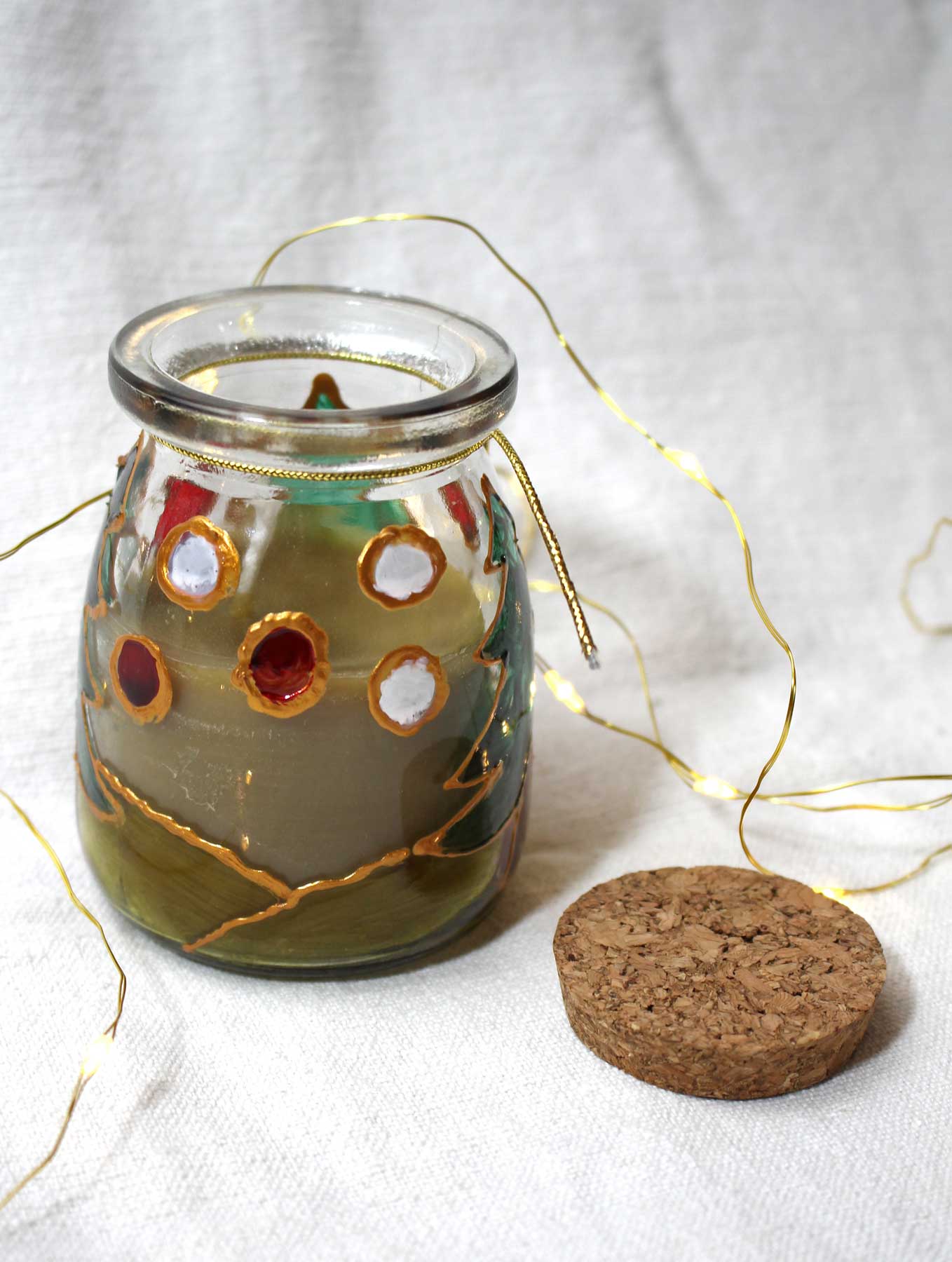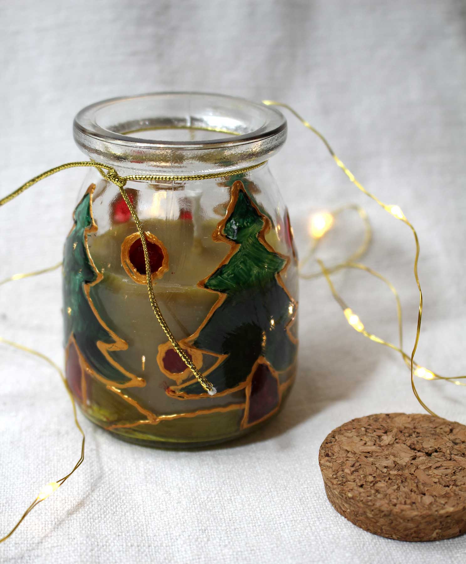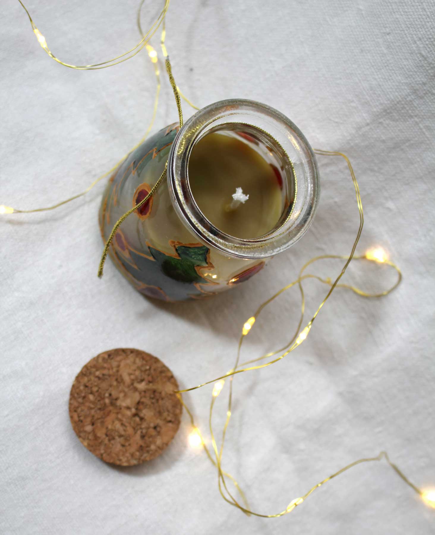 Mic felinar de Crăciun, pictat la mâna liberă cu brăduți și globuri, în care a fost turnată ceară curată de albine. Produs unicat.