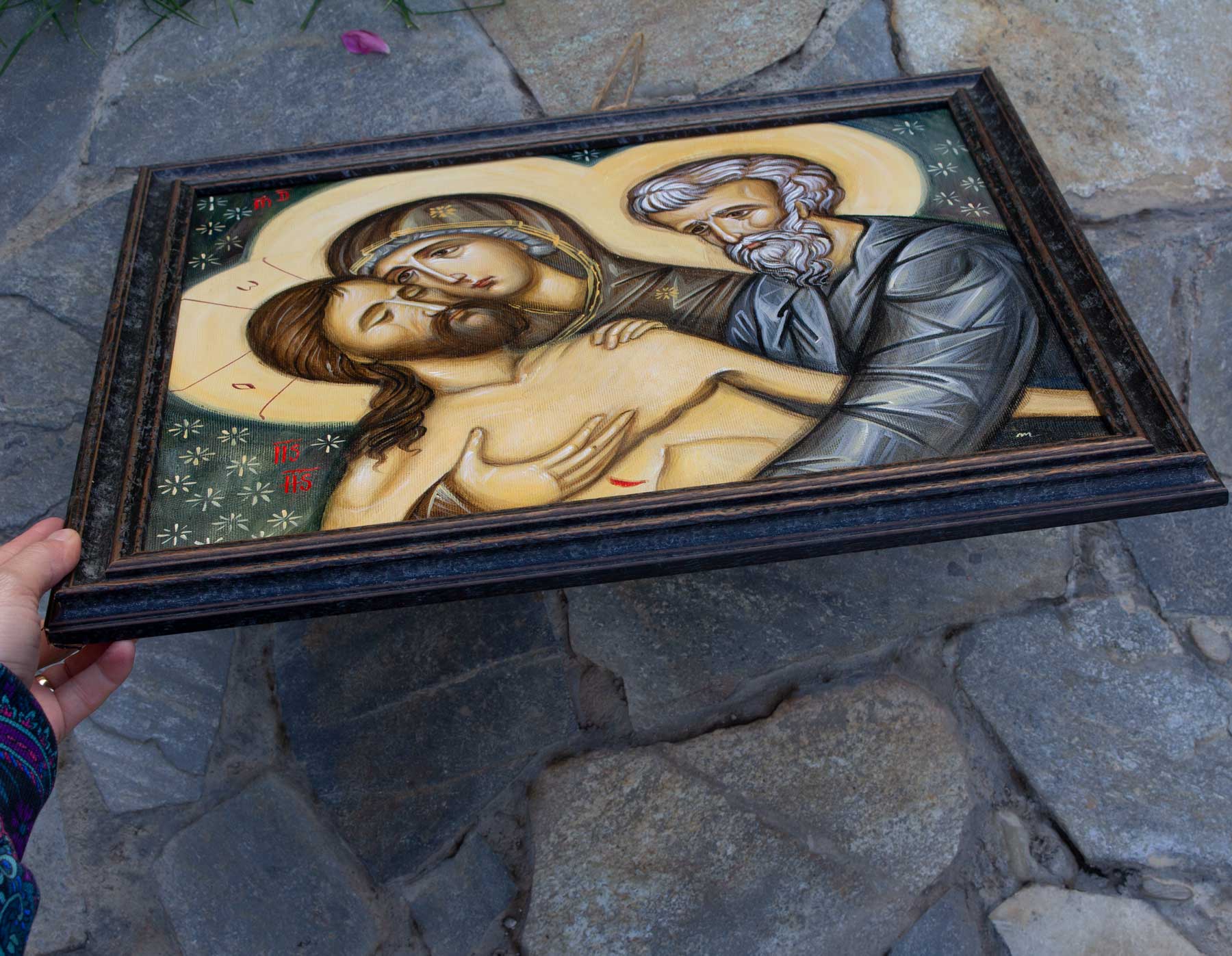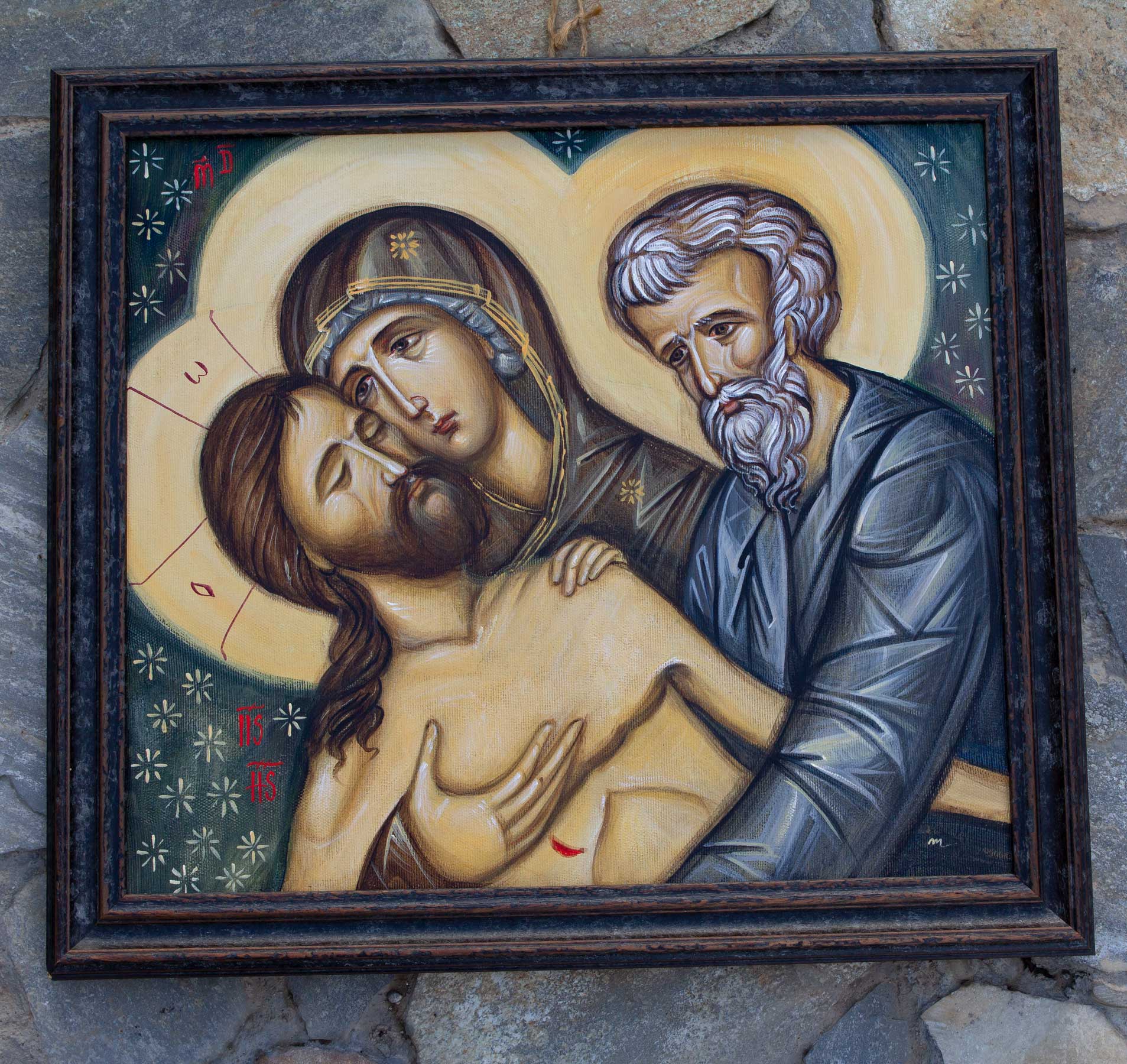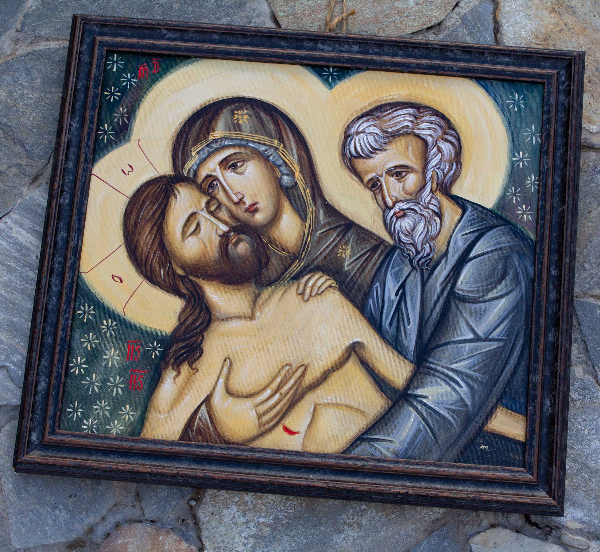 Icoana are reprezentate central chipurile lui Hristos și a Maicii Sale, precum și a lui Iosif din Arimateea (cel care a venit să acopere cu miresme trupul lui Hristos). Aceasta a fost pictată în tehnica mixtă (culori tempera și acrilice), în straturi succesive, iar la final s-a aplicat vernis de protecție. Este o lucrare de colecție, pictată în anul 2016.