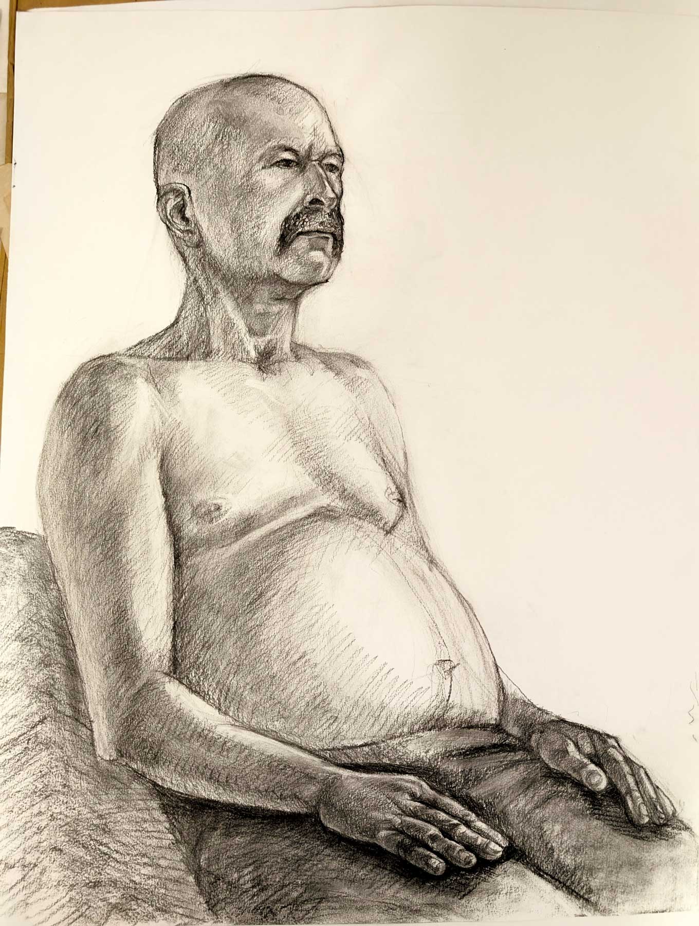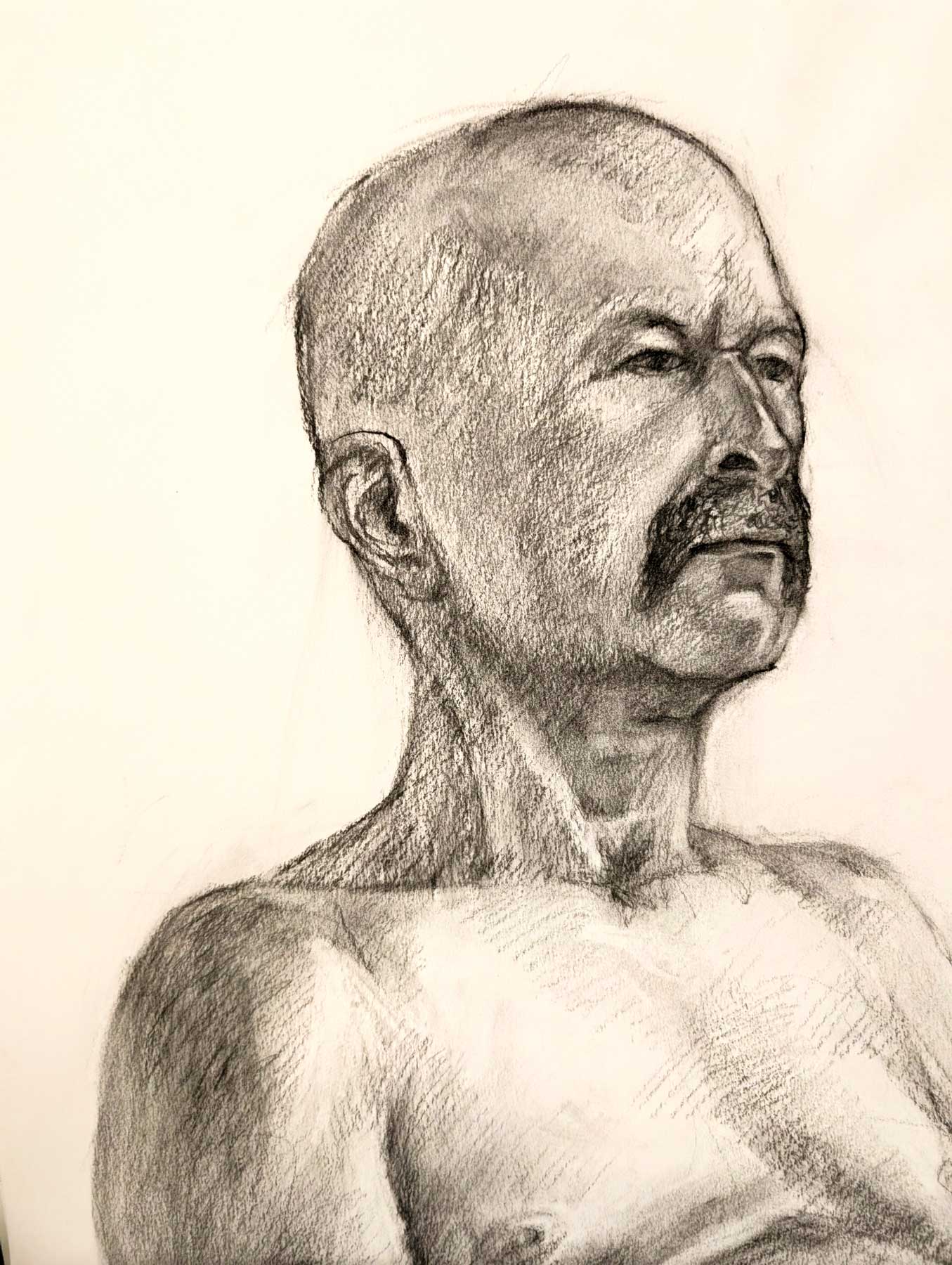 Portret cu mâini- studiu de desen în cărbune pe hârtie, realizat după model viu. Lucrare originală; se vinde fără ramă.