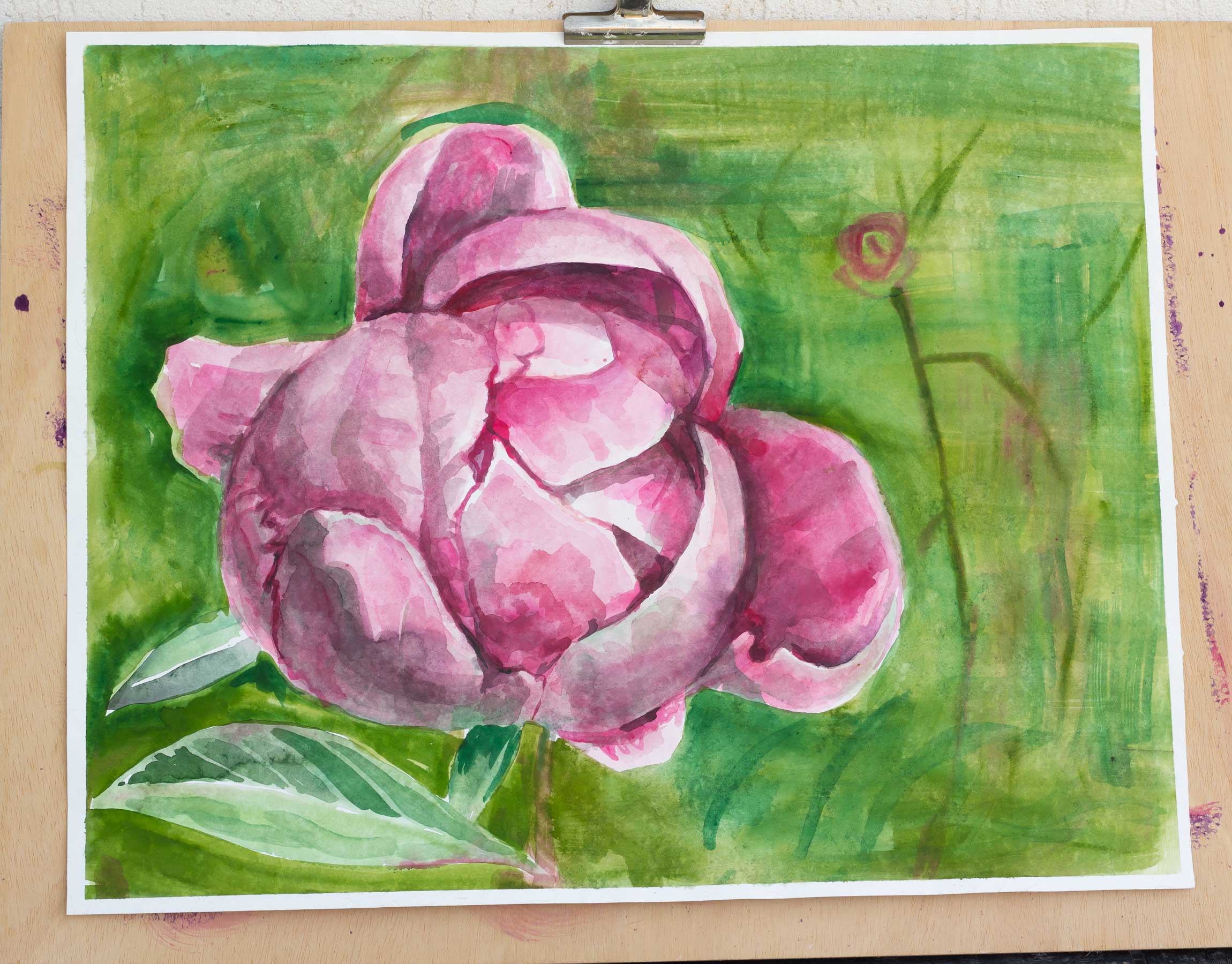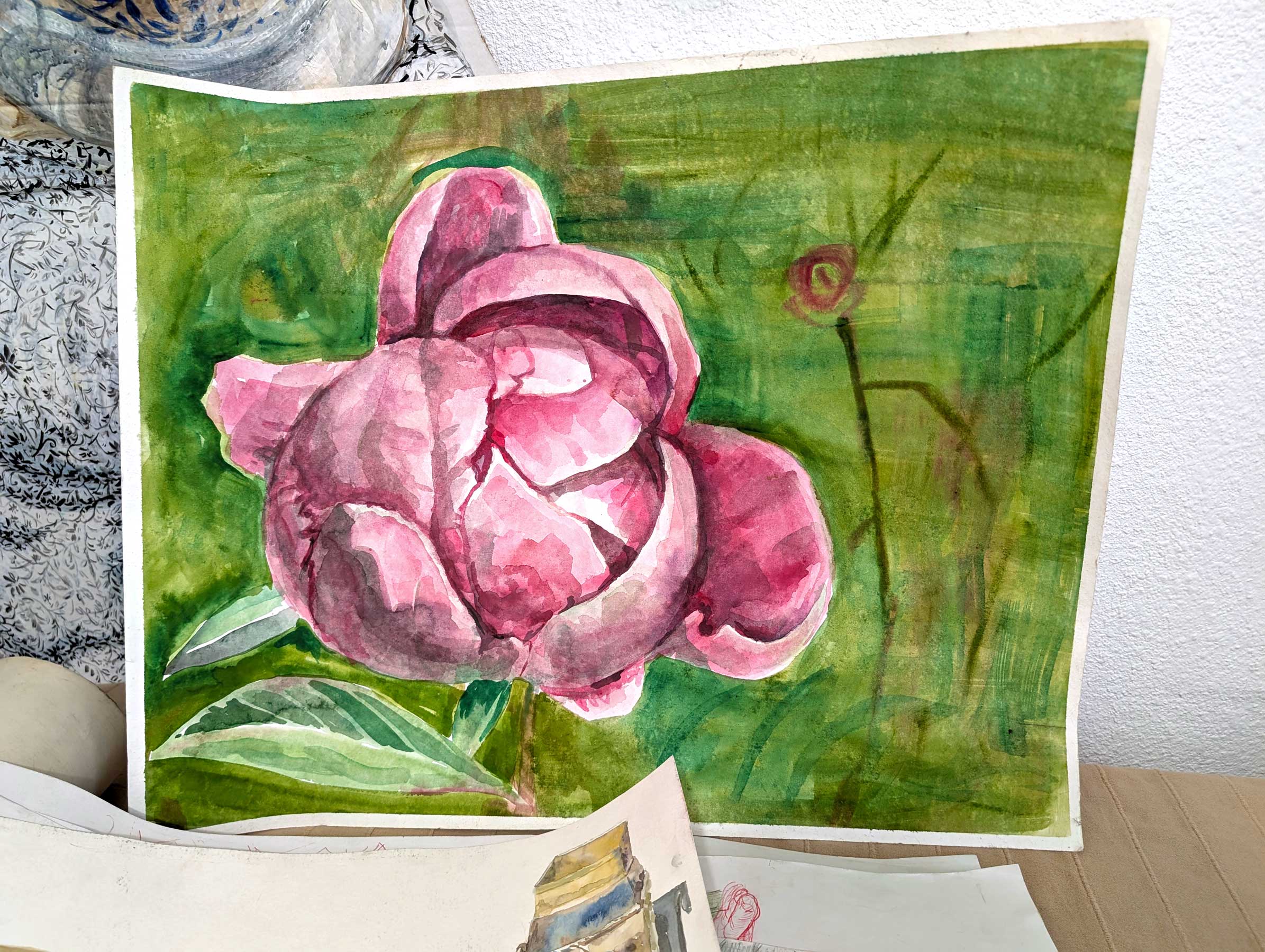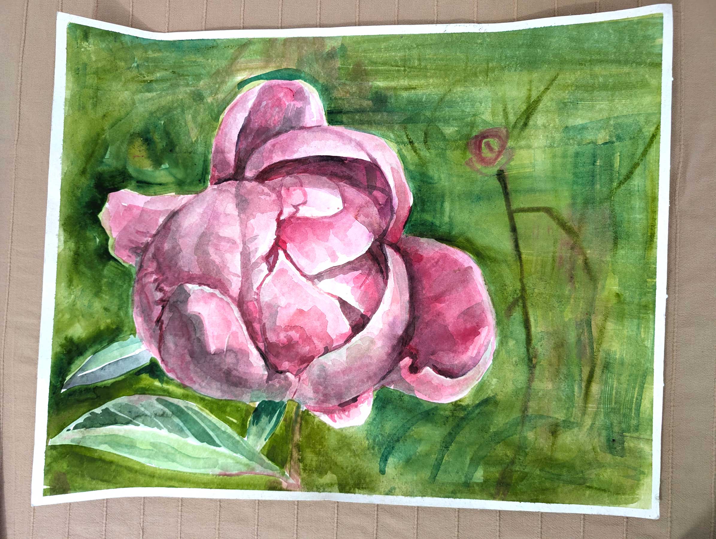Bujor roz – pictură realizată în acuarelă și guașă pe hârtie specială de acuarelă. Dimensiunile lucrării / planșei sunt 700/557 mm. Lucrarea se vinde fără ramă, așa cum se poate vedea în poze.