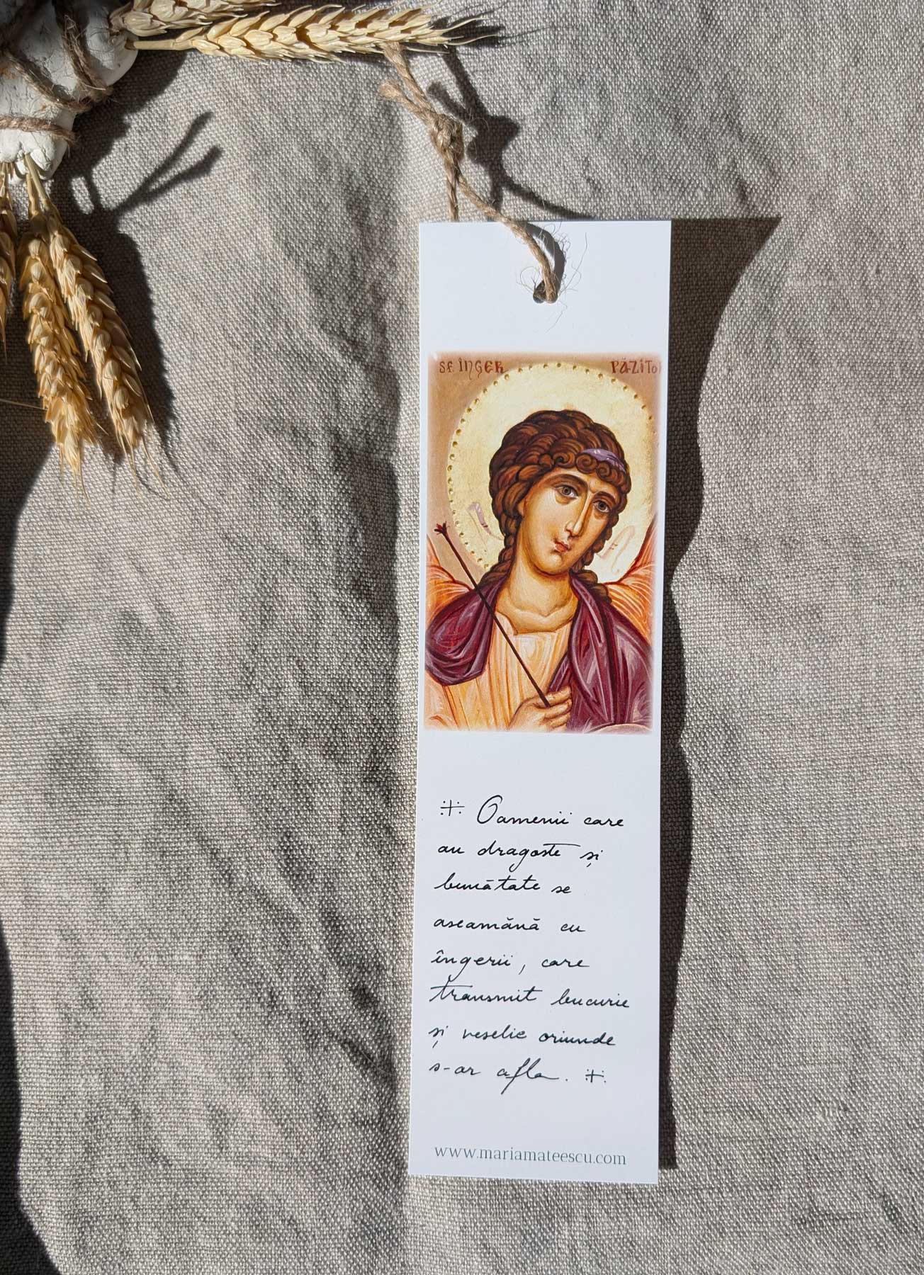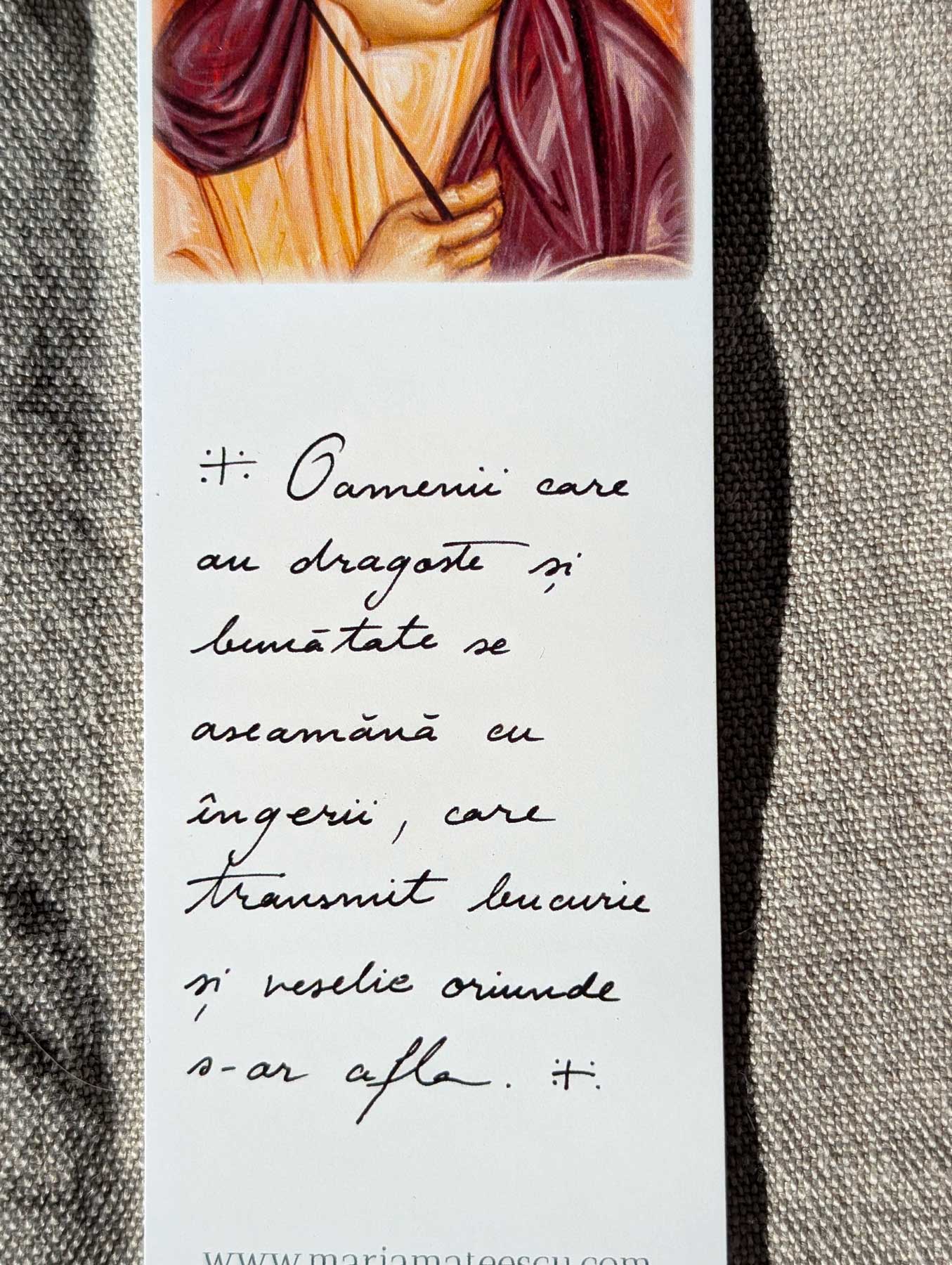 Semne de carte realizate cu citate folositoare, scrise de mână, și imagini după lucrările proprii. Fiecare semn de carte poartă în partea de sus o agățătoare din sfoară.