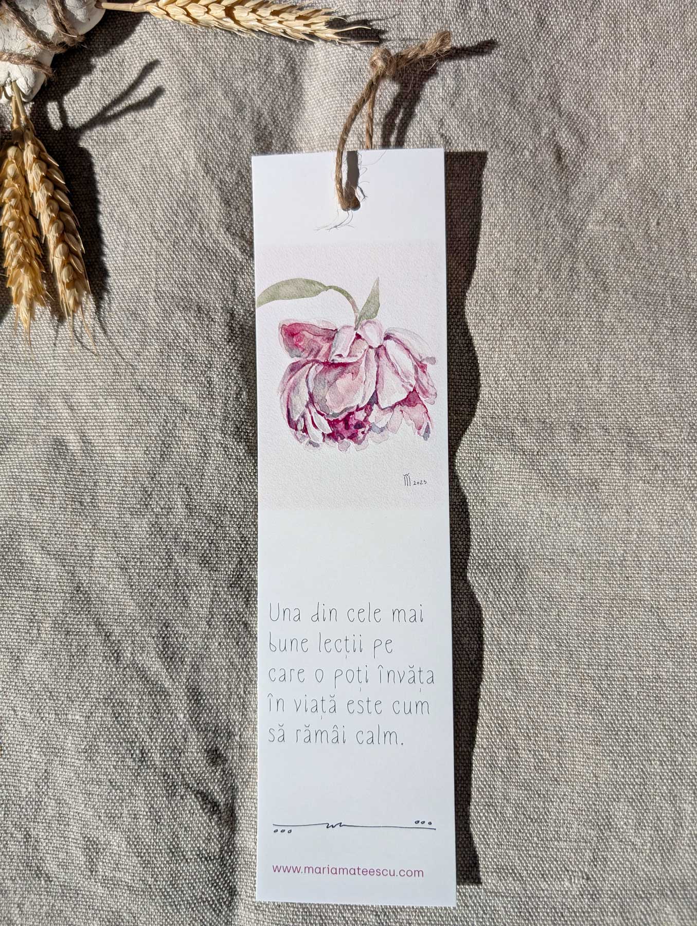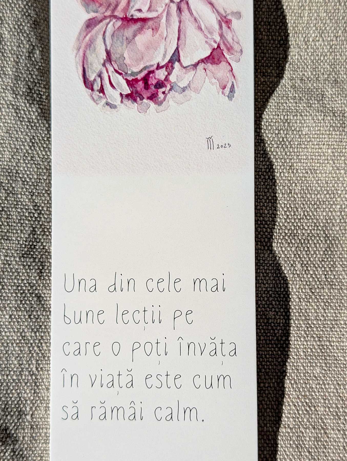 Semne de carte realizate cu citate folositoare, scrise de mână, și imagini după lucrările proprii. Fiecare semn de carte poartă în partea de sus o agățătoare din sfoară.