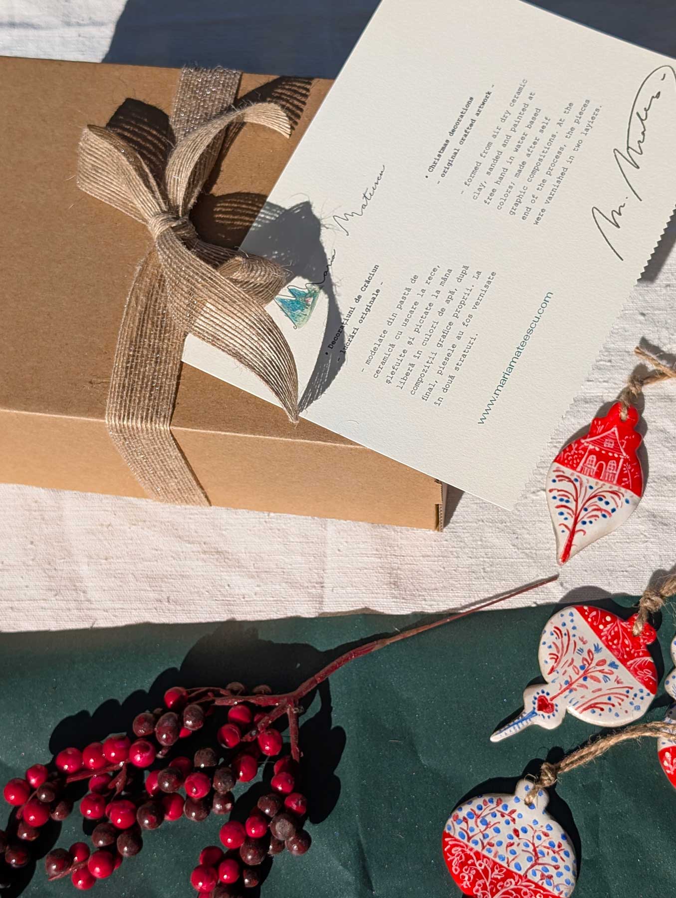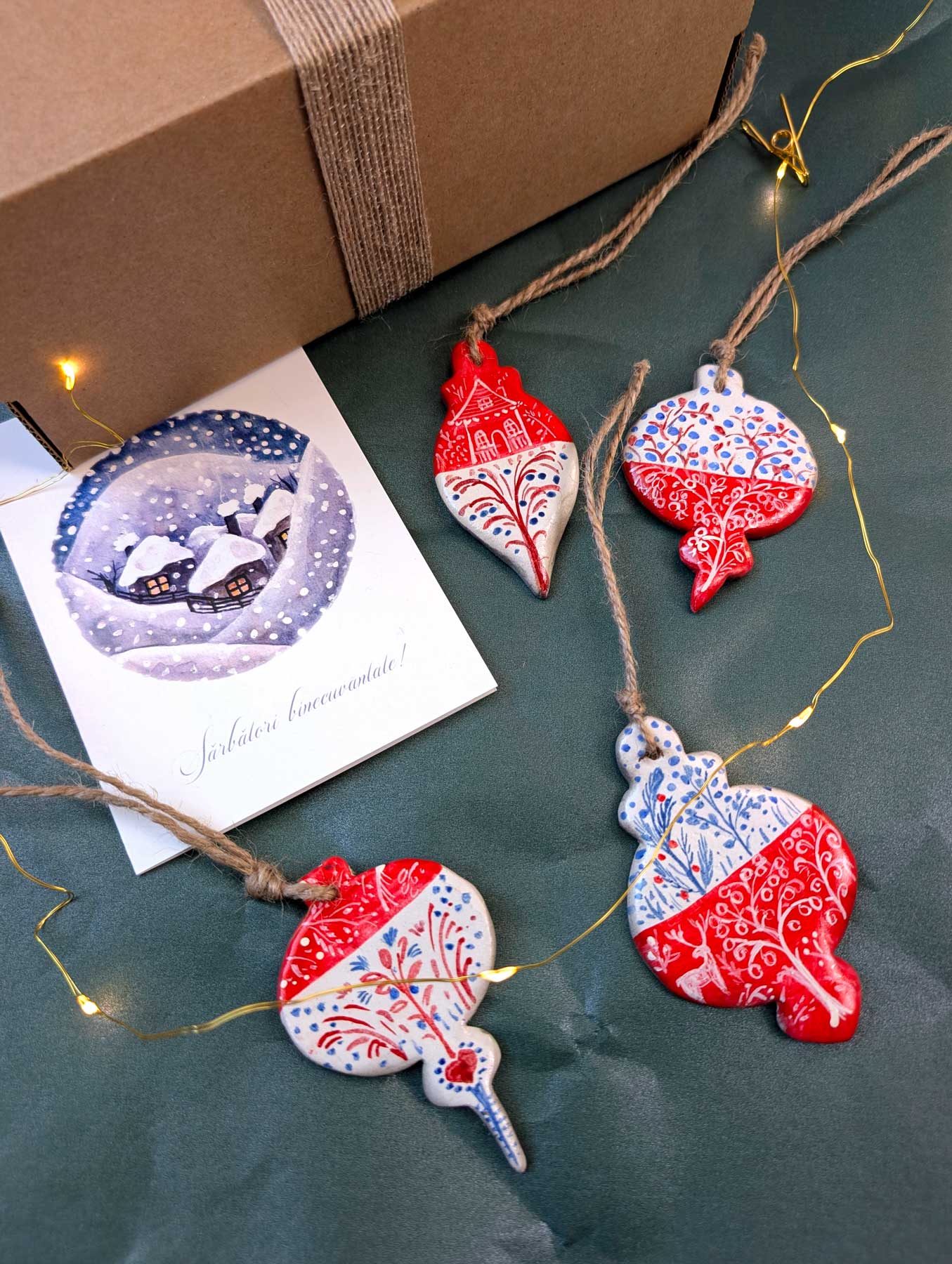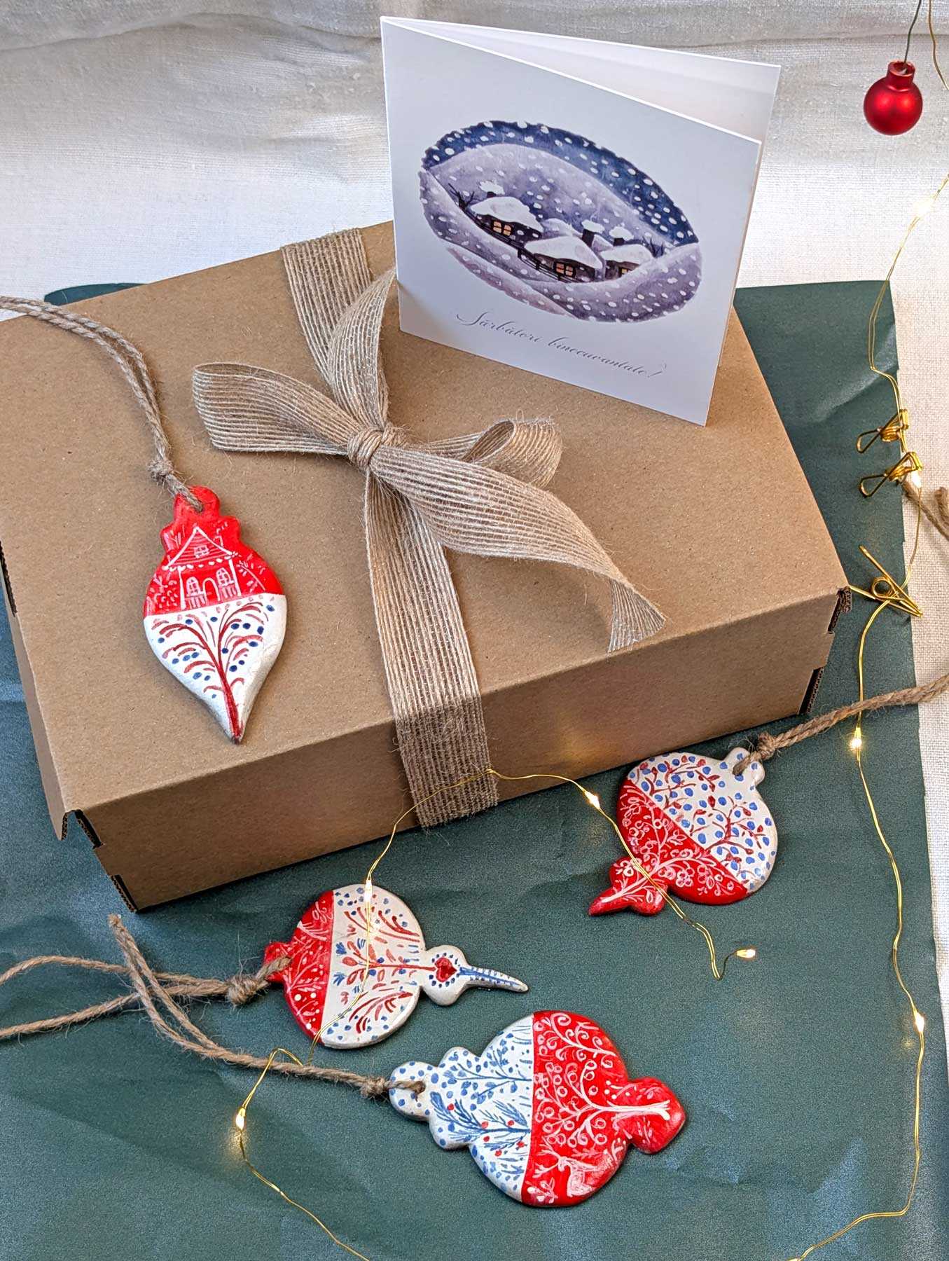 Set cadou pentru Crăciun (2) – decorațiuni create 100% manual (4 piese) + felicitare
