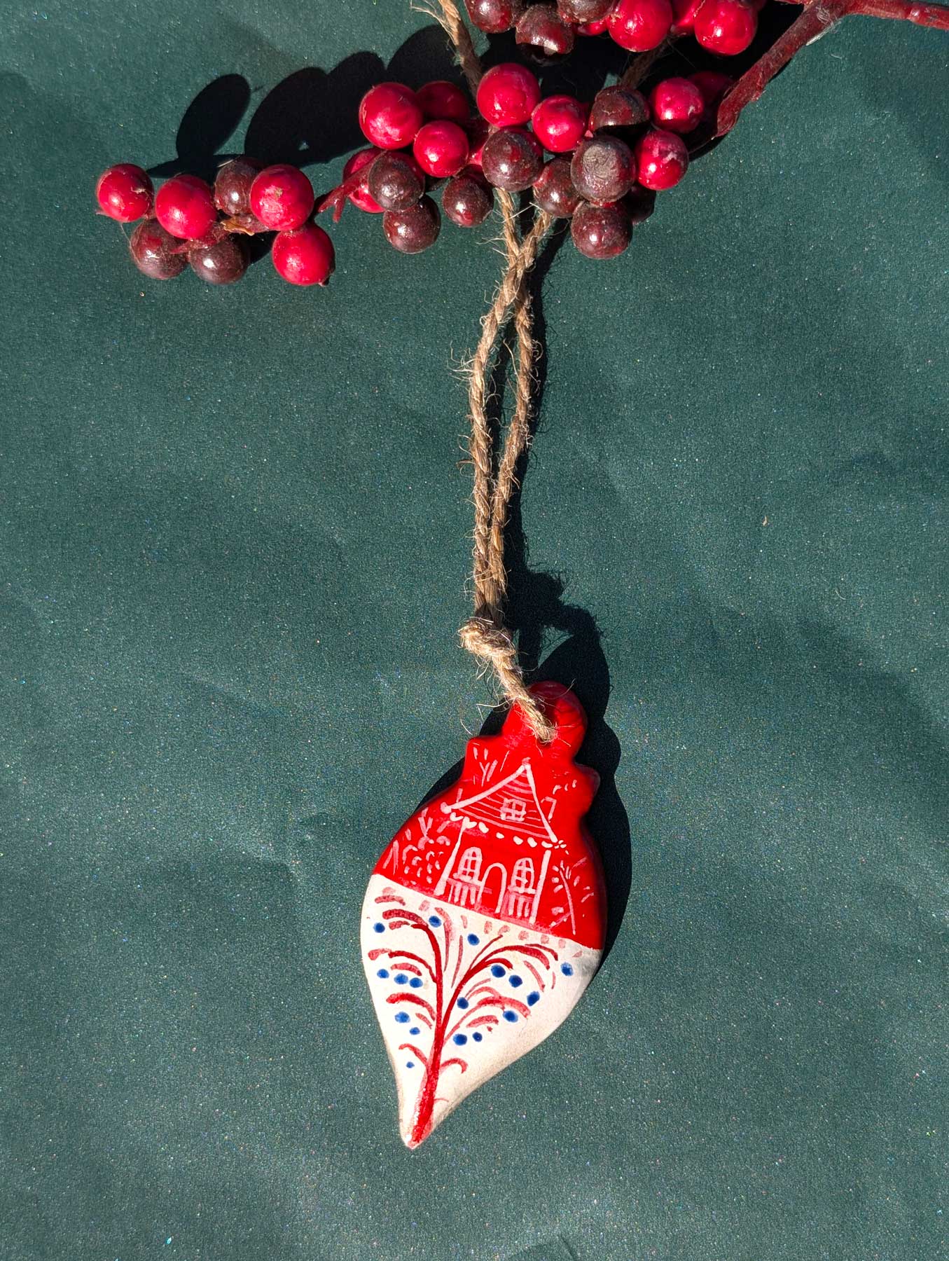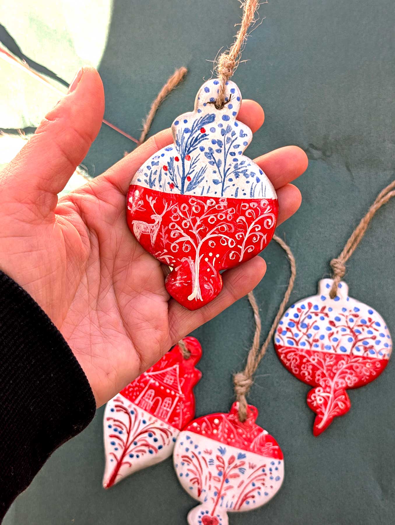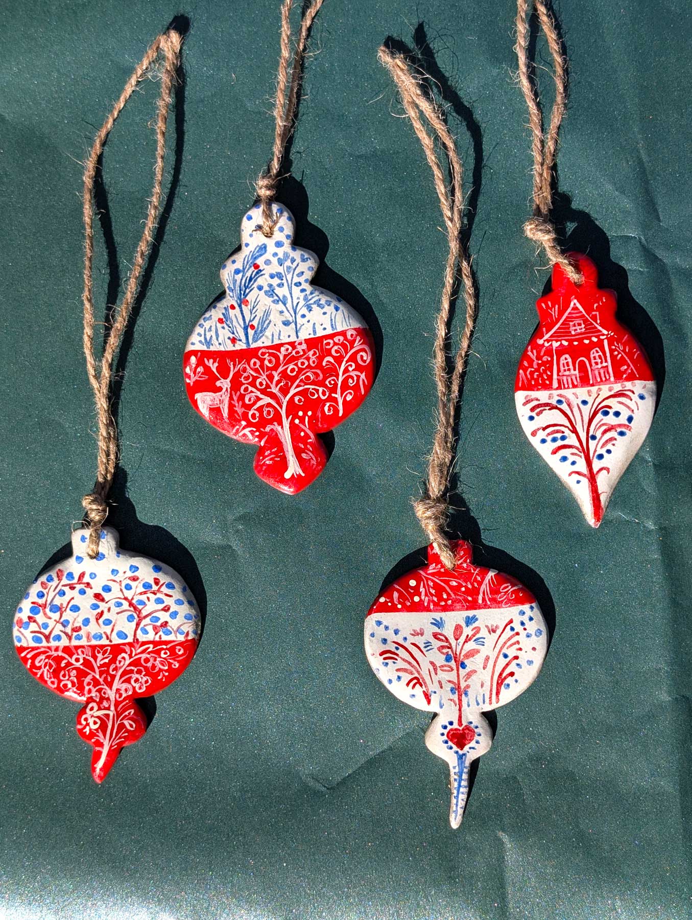 Set cadou Crăciun realizat din decorațiuni în formă de globuri, modelate, șlefuite și pictate la mâna liberă în culori de apă. Compoziția grafică pictată pe globuri este unică. La sfârșit, globurile au fost vernisate în două straturi.