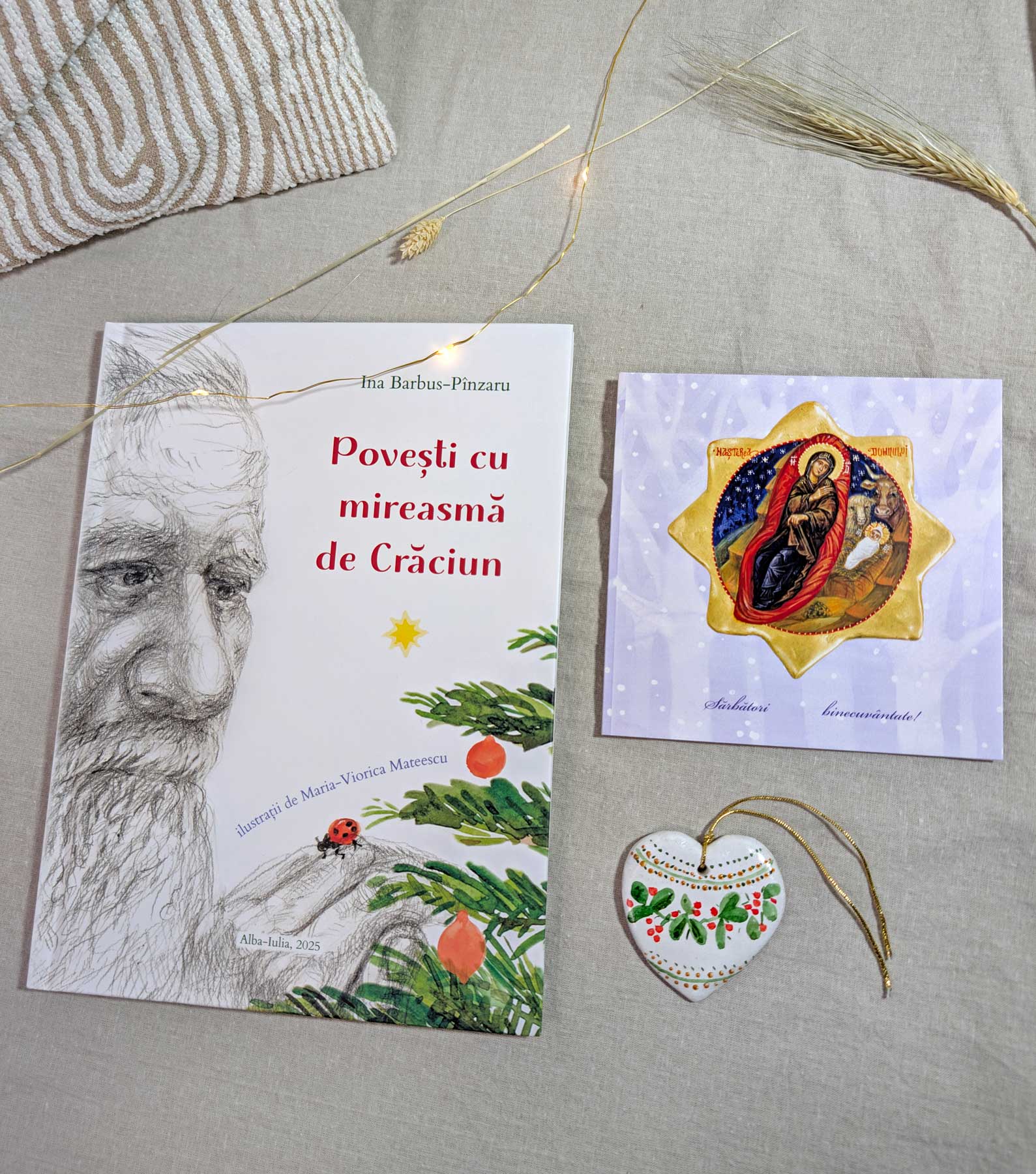 Set cadou pentru Crăciun ce conține: ocarte cu Povești cu mireasmă de Crăciun, o decorațiune în formă de inimă modelată, pictată și vernisată manual (modelul poate diferi) și o felicitare cu Nașterea Domnului.