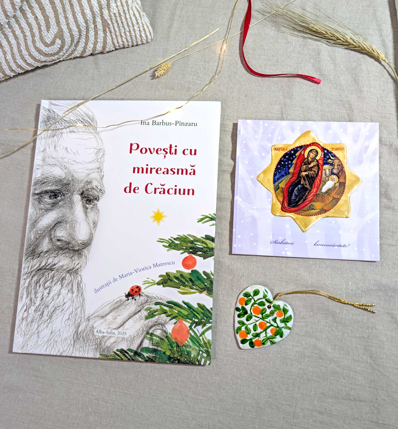 Set cadou pentru Crăciun ce conține: ocarte cu Povești cu mireasmă de Crăciun, o decorațiune în formă de inimă modelată, pictată și vernisată manual (modelul poate diferi) și o felicitare cu Nașterea Domnului.