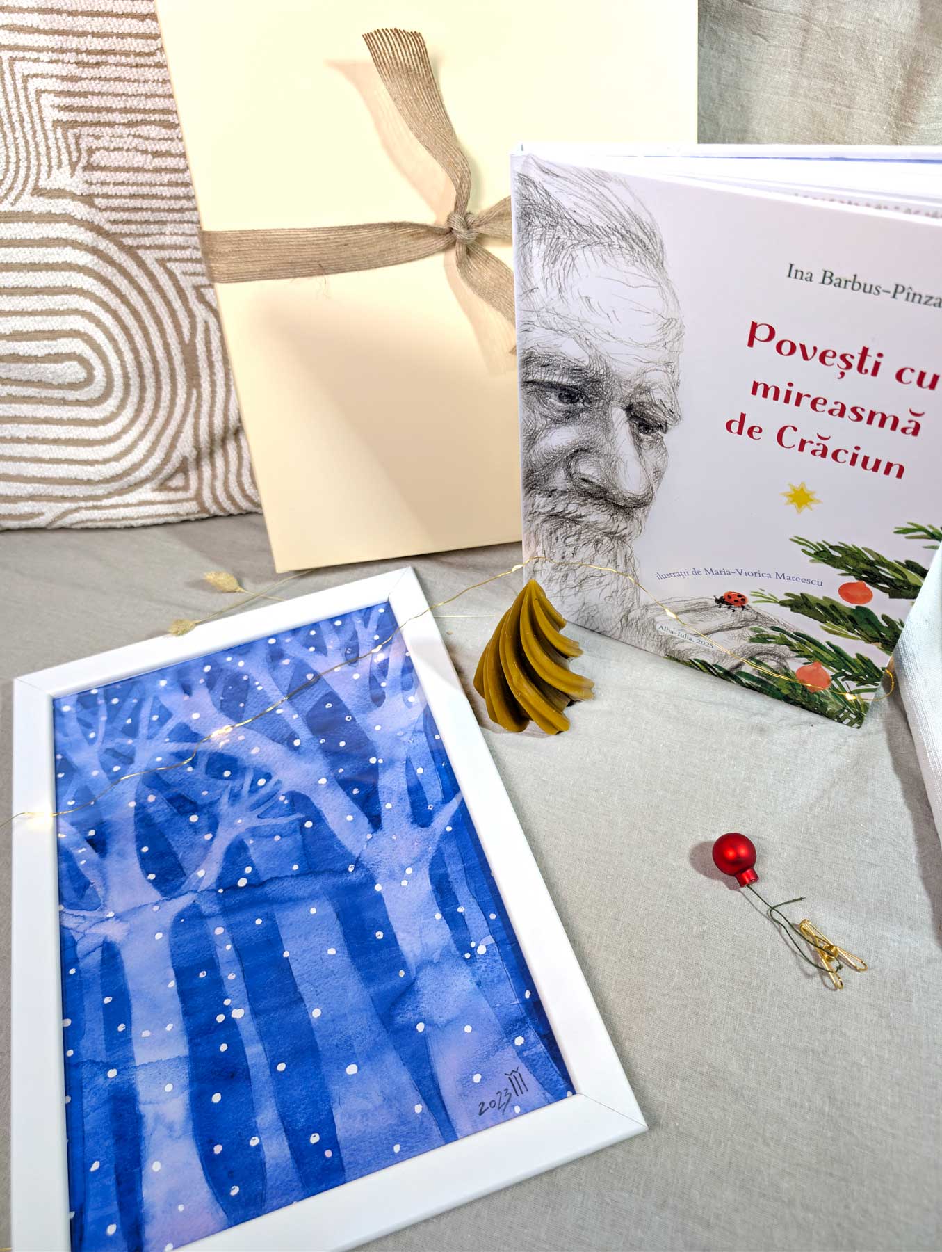 Set cadou: tablou cu peisaj de iarnă fantastic, lumânare din ceară curată și carte de povești