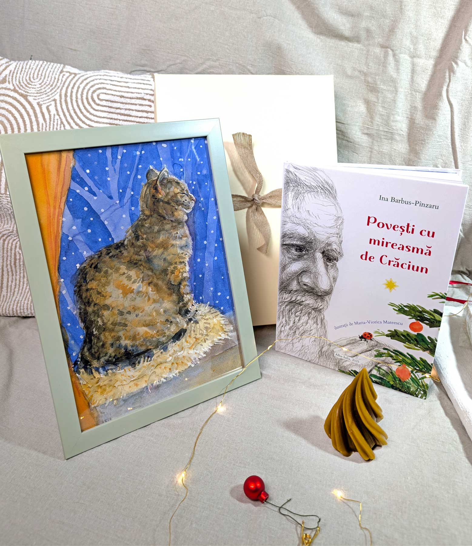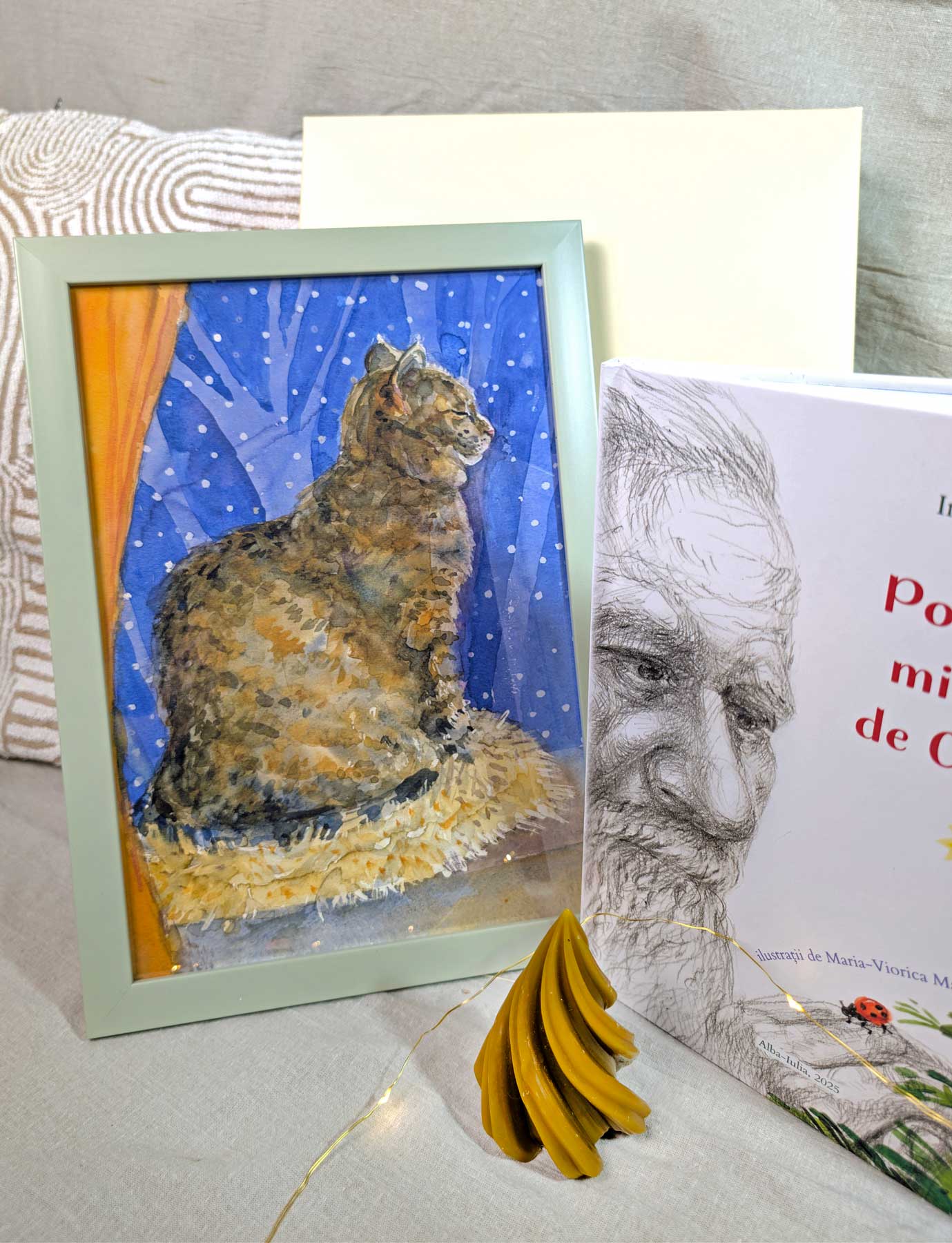 Set cadou: tablou cu pisică, lumânare din ceară curată și carte de povești