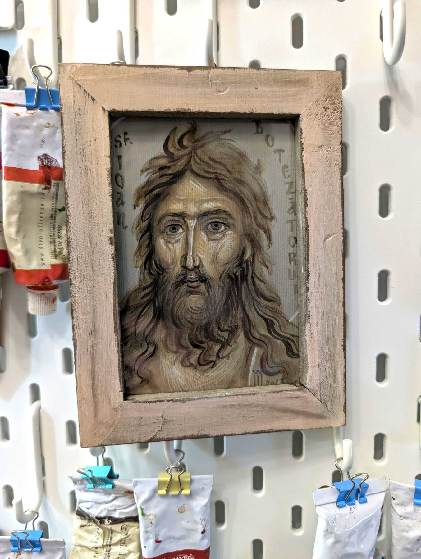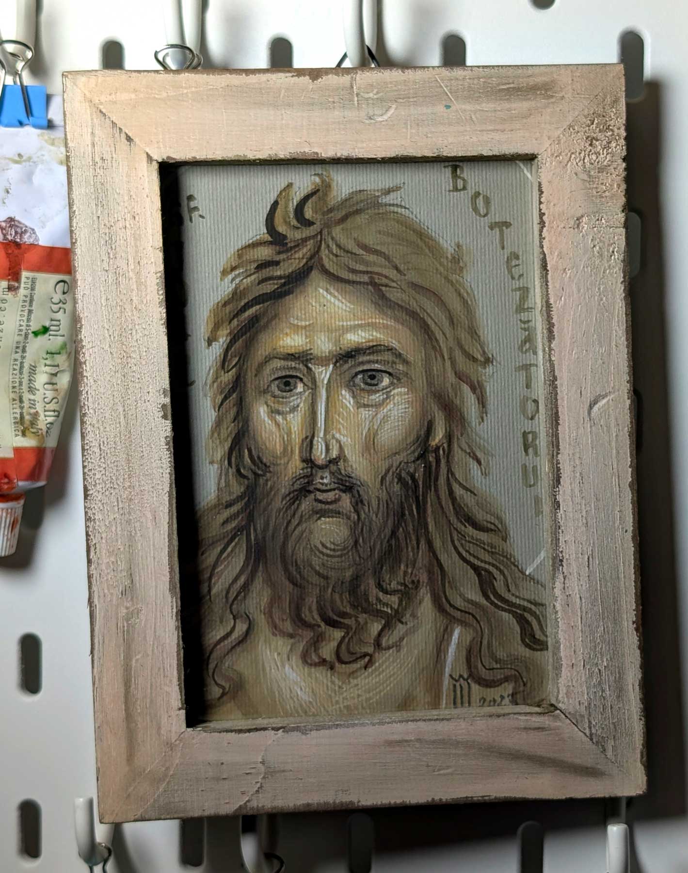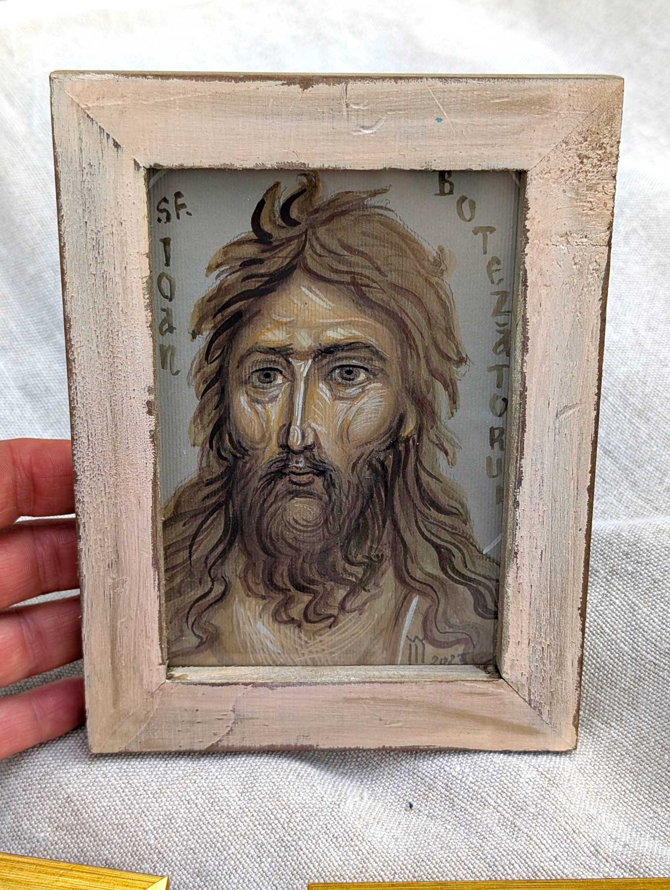 Sfântul Ioan Botezătorul – icoană pictată pe hârtie tonată groasă, texturată, în culori de apă. Rama este din lemn natur patinat.