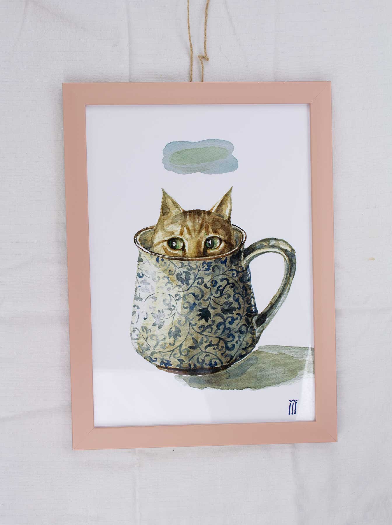 Tablou cu pisică – „Pisa”- Print de artă, ramă roz