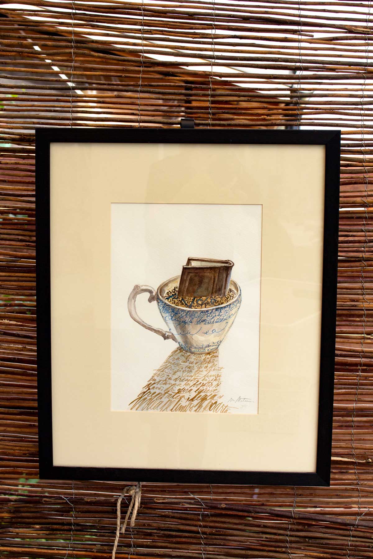 Tablou original: față în față cu ideile din cărțile pe care le citim, la o cană de ceai. Scrierile se revarsă în umbra corpului cănii, iar cana de ceai este un prilej de meditație și cugetare la cele pe care le-am citit.